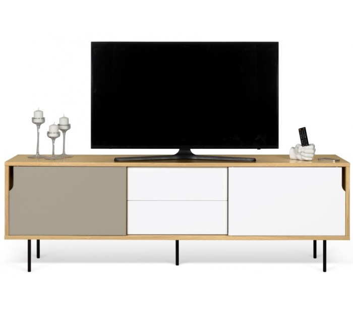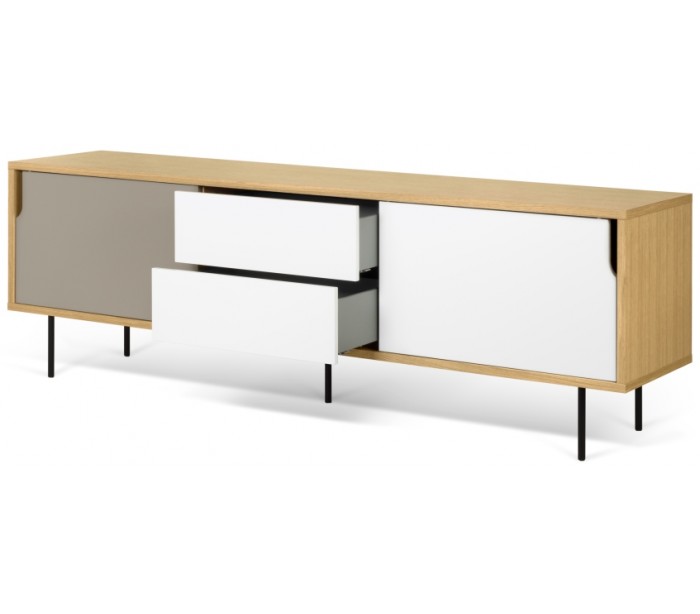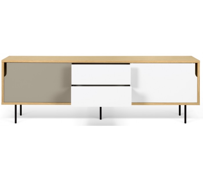 TemaHome Dann tvbord udført i et design af mat hvid, mat grå og egetræsfarvet MDF med ben i sortlakeret metal. Tvbordet måler 65 cm i højden og 201 x 45 cm i bredde og dybde. Tvbordet indeholder 2 skydelåger, hvert med 2 hylderum bag lågen - hertil 2 skuffer med push open funktion.