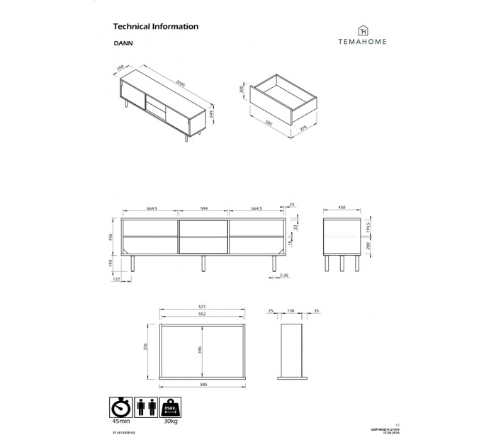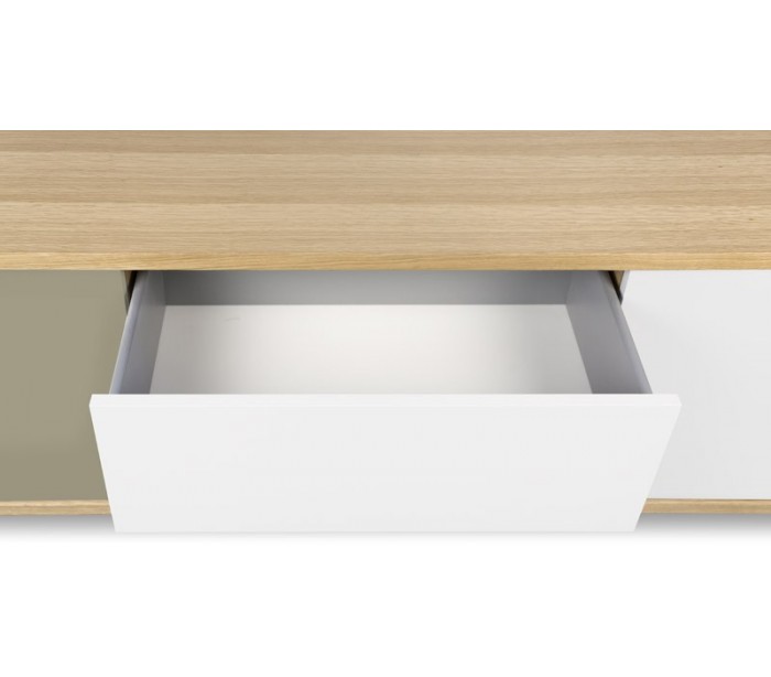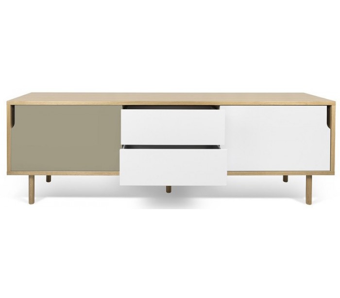 TemaHome Dann tvbord udført i et design af mat hvid, mat grå og egetræsfarvet MDF med ben i massiv egetræ. Tvbordet måler 65 cm i højden og 201 x 45 cm i bredde og dybde. Tvbordet indeholder 2 skydelåger, hvert med 2 hylderum bag lågen - hertil 2 skuffer med push open funktion.