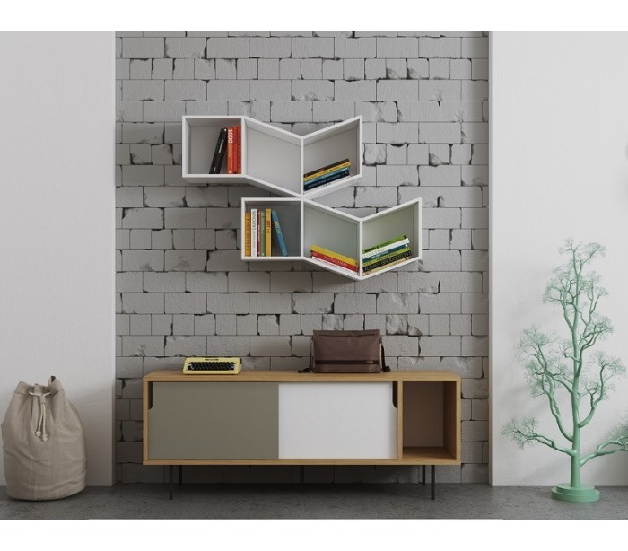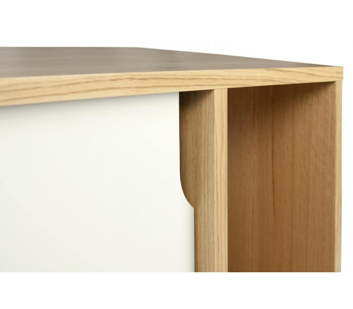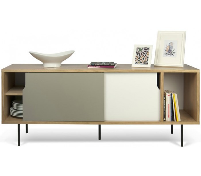 TemaHome Dann tvbord udført i et design af mat hvid, mat grå og egetræsfarvet MDF med ben i sortlakeret metal. Tvbordet måler 65 cm i højden og 165 x 45 cm i bredde og dybde. Tvbordet indeholder 2 skydelåger, hvert med 2 hylderum bag lågen - hertil 1 åbent hylderum.