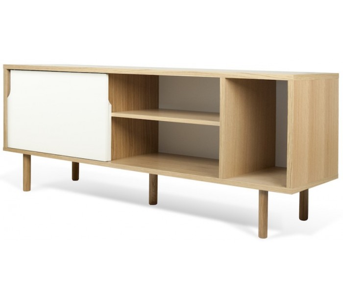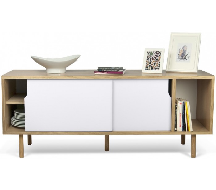 TemaHome Dann tvbord udført i et design af mat hvid og egetræsfarvet MDF med ben i massiv egetræ. Tvbordet måler 65 cm i højden og 165 x 45 cm i bredde og dybde. Tvbordet indeholder 2 skydelåger, hvert med 2 hylderum bag lågen - hertil 1 åbent hylderum.