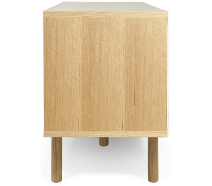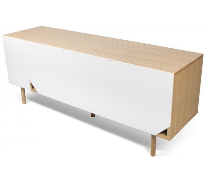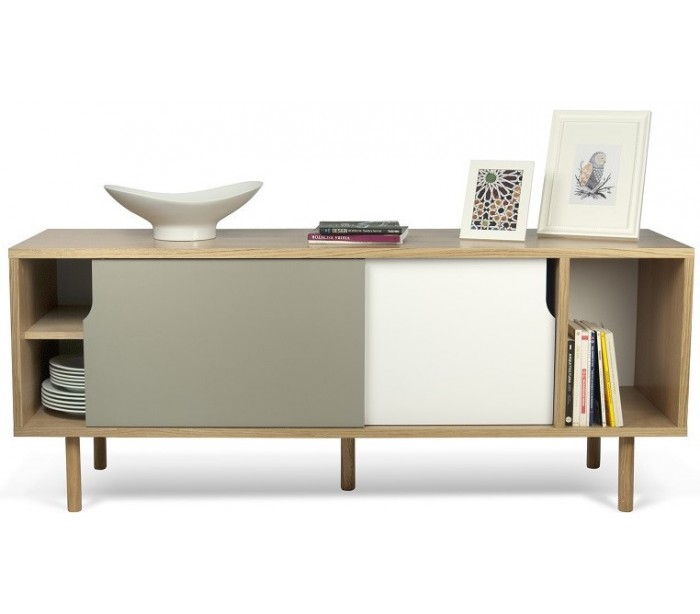 TemaHome Dann tvbord udført i et design af mat hvid, mat grå og egetræsfarvet MDF med ben i massiv egetræ. Tvbordet måler 65 cm i højden og 165 x 45 cm i bredde og dybde. Tvbordet indeholder 2 skydelåger, hvert med 2 hylderum bag lågen - hertil 1 åbent hylderum.