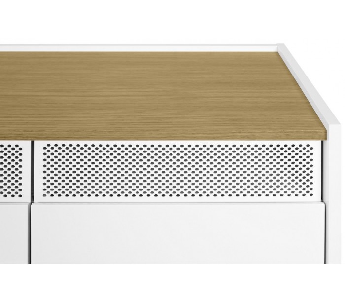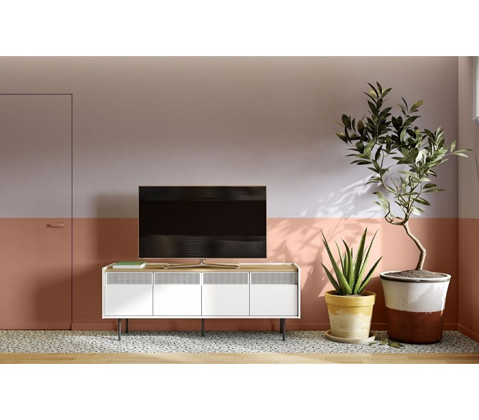 TemaHome Radio tvbord udført i et design af mat hvid og egetræsfinér med ben i sortlakeret metal. Tvbordet måler 60 cm i højden og 160 x 43 cm i bredde og dybde. Tvbordet indeholder 2 dobbeltskabe og 2 dobbelte hylderum.