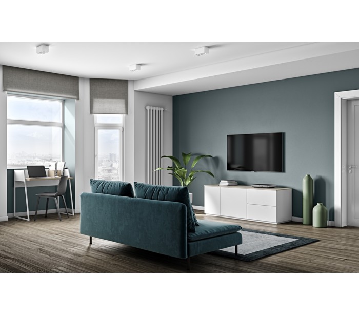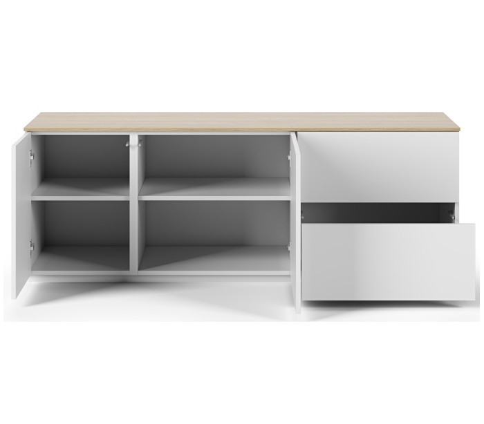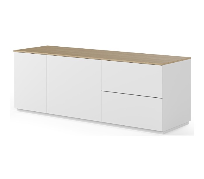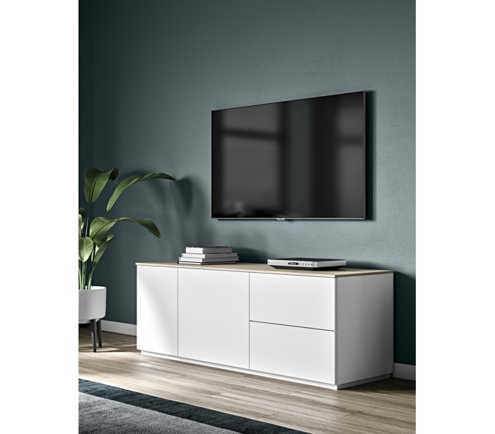 TemaHome Join tvbord udført i et design af mat hvid og egetræsfarvet mdf og finér. Tvbordet måler 57 cm i højden og 160 x 50 cm i bredde og dybde og indeholder 2 skuffer samt 2 skabe, hvert med 2 hylderum.