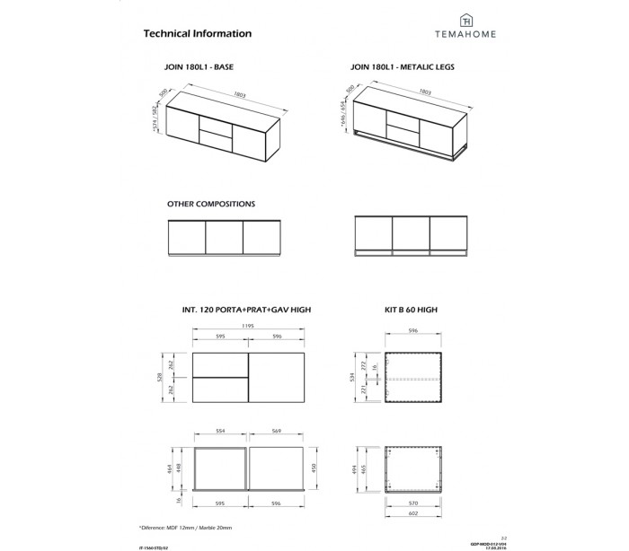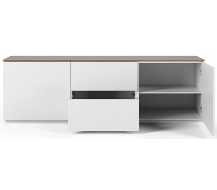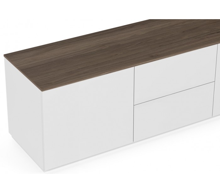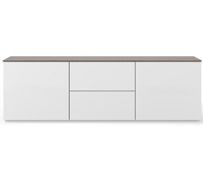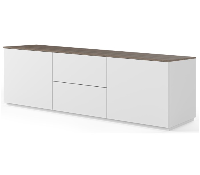 TemaHome Join tvbord udført i et design af mat hvid og valnøddefarvet mdf og finér. Tvbordet måler 57 cm i højden og 180 x 50 cm i bredde og dybde og indeholder 2 skuffer samt 2 skabe, hvert med 2 hylderum.