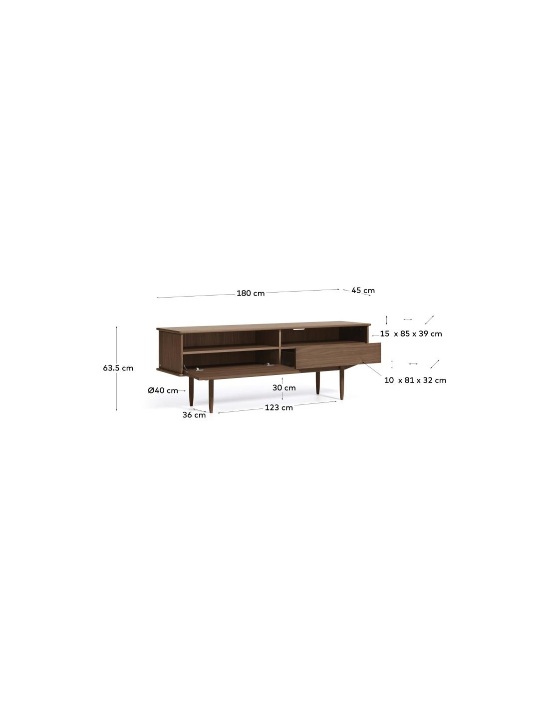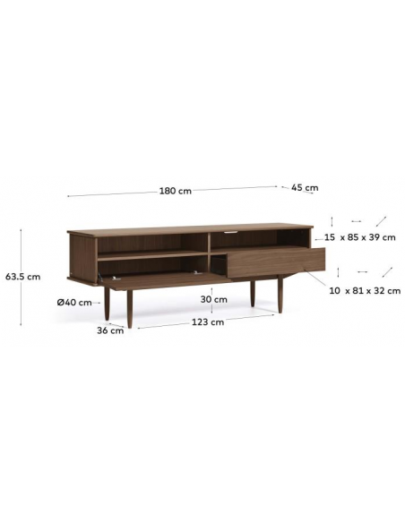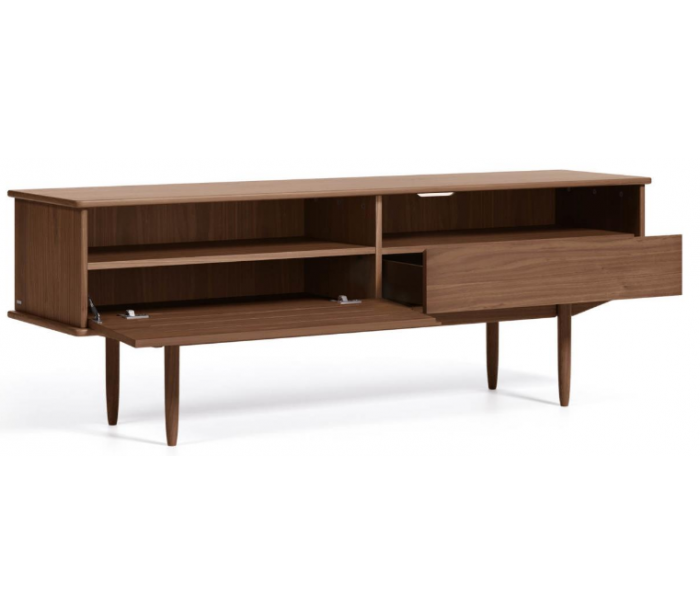 Tvbord med 1 skab, 1 skuffe og 2 åbne hylderum, udført i et skandinavisk design fra LaForma. Tvbordet er fremstillet i valnøddetræ og finér og måler 180 cm i bredden.