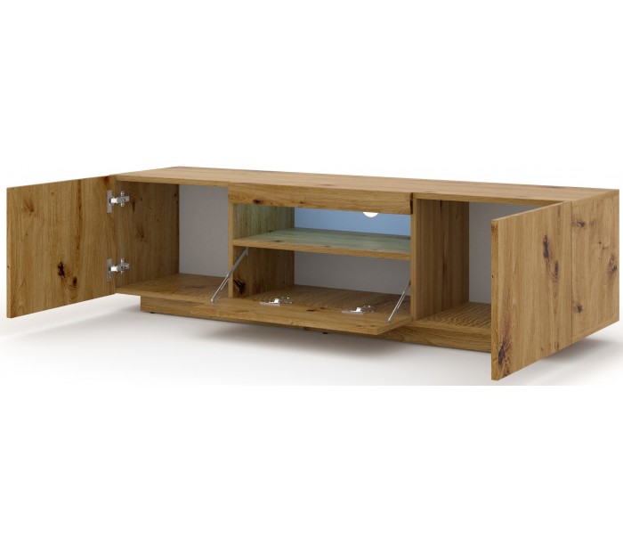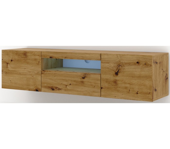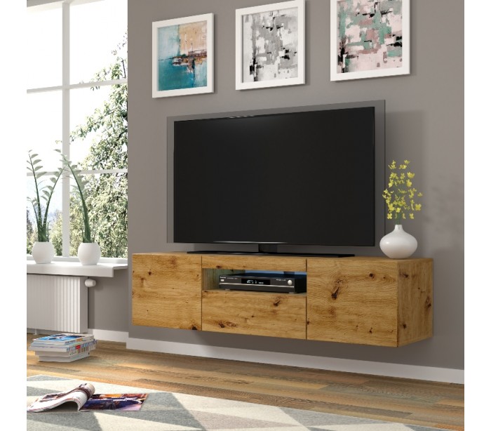 Aura tvbord udført i et design af vild egetræsfarvet møbelplade. Tvbordet måler 36 - 42 cm i højden og 150 x 37 cm i bredde og dybde. Tvbordet indeholder 3 skabe, hvert med 1 hylderum. Hertil 1 åbent hylderum. Tvbordet kan enten stå på gulvet, eller hænges op på væggen. Højden ved væg er 36 cm og på gulv, 42 cm.
