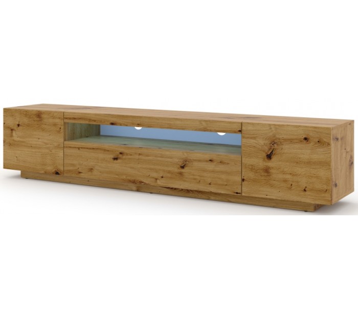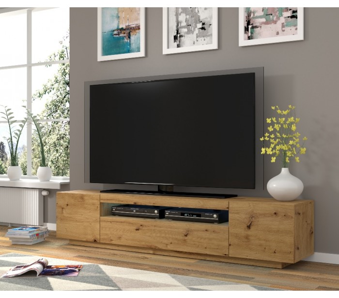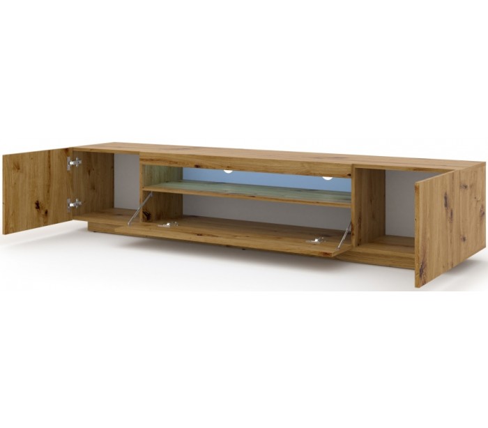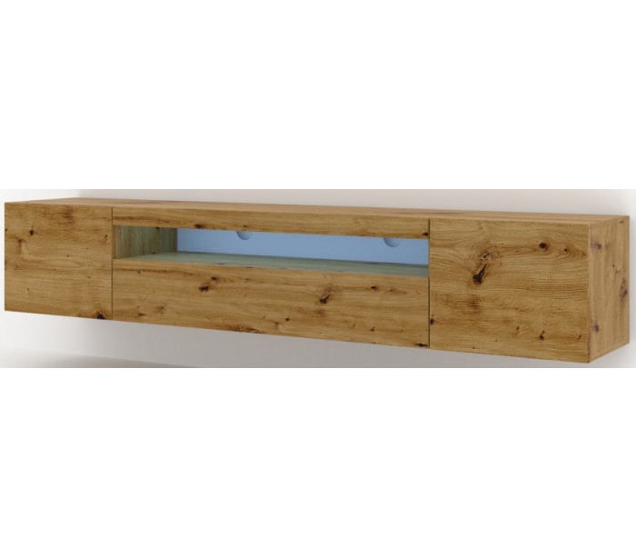 Aura tvbord udført i et design af vild egetræsfarvet møbelplade. Tvbordet måler 36 - 42 cm i højden og 200 x 37 cm i bredde og dybde. Tvbordet indeholder 3 skabe, hvert med 1 hylderum. Hertil 1 åbent hylderum. Tvbordet kan enten stå på gulvet, eller hænges op på væggen. Højden ved væg er 36 cm og på gulv, 42 cm. Åbent hylderum er 100 cm i bredden og 8 cm i højden.
