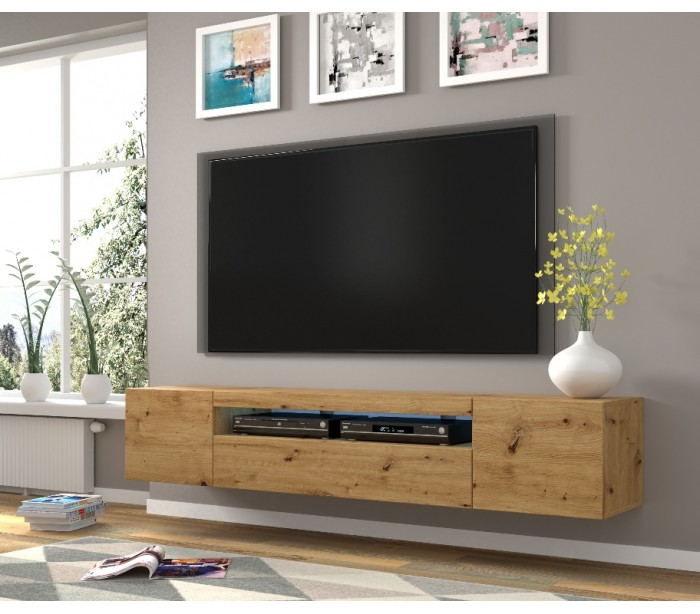 Aura tvbord udført i et design af vild egetræsfarvet møbelplade. Tvbordet måler 36 - 42 cm i højden og 200 x 37 cm i bredde og dybde. Tvbordet indeholder 3 skabe, hvert med 1 hylderum. Hertil 1 åbent hylderum. Tvbordet kan enten stå på gulvet, eller hænges op på væggen. Højden ved væg er 36 cm og på gulv, 42 cm.