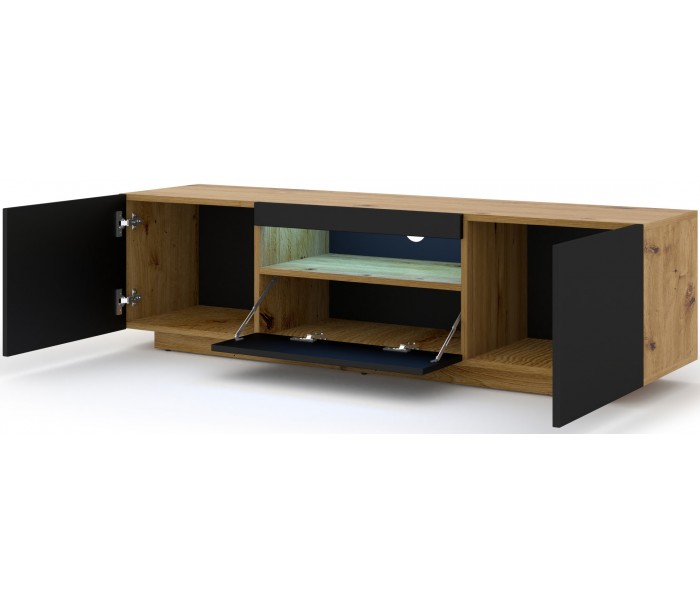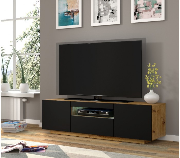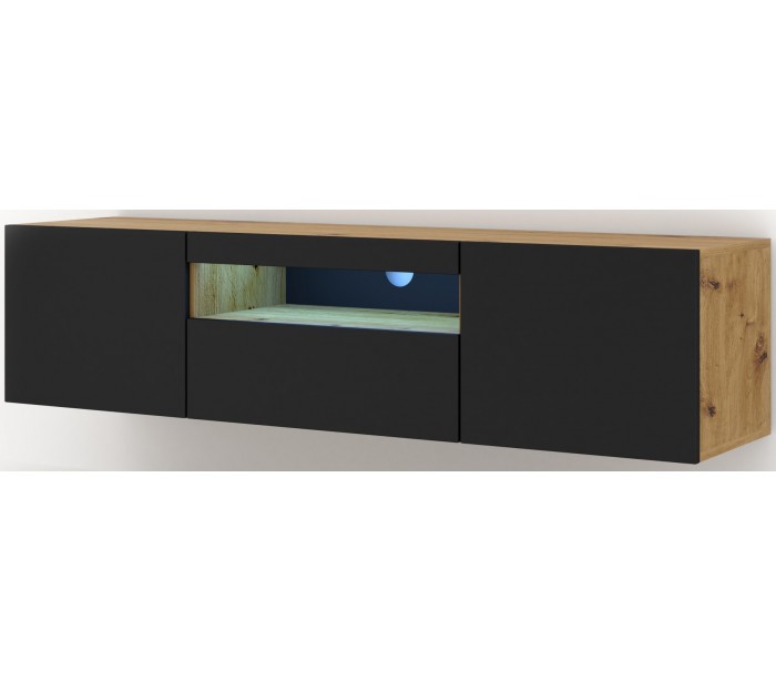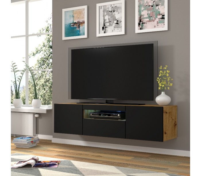 Aura tvbord udført i et design af mat sort og vild egetræsfarvet møbelplade. Tvbordet måler 36 - 42 cm i højden og 150 x 37 cm i bredde og dybde. Tvbordet indeholder 3 skabe, hvert med 1 hylderum. Hertil 1 åbent hylderum. Tvbordet kan enten stå på gulvet, eller hænges op på væggen. Højden ved væg er 36 cm og på gulv, 42 cm.