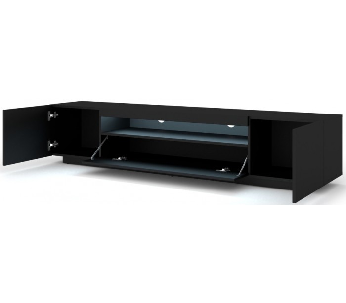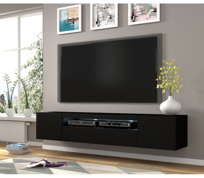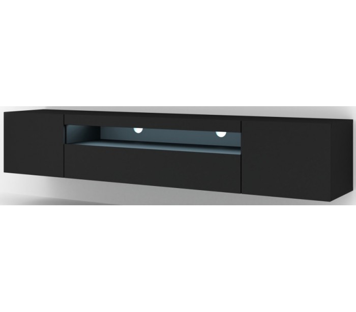 Aura tvbord udført i et design af mat sort møbelplade. Tvbordet måler 36 - 42 cm i højden og 200 x 37 cm i bredde og dybde. Tvbordet indeholder 3 skabe, hvert med 1 hylderum. Hertil 1 åbent hylderum. Tvbordet kan enten stå på gulvet, eller hænges op på væggen. Højden ved væg er 36 cm og på gulv, 42 cm. Åbent hylderum er 100 cm i bredden og 8 cm i højden.