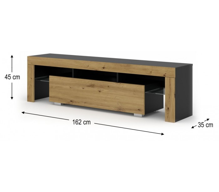 Emu tvbord udført i et design af mat sort og vild egetræsfarvet møbelplade. Tvbordet måler 45 cm i højden og 162 x 35 cm i bredde og dybde. Tvbordet indeholder 1 skab med 2 hylderum. Hertil 5 åbne hylderum.