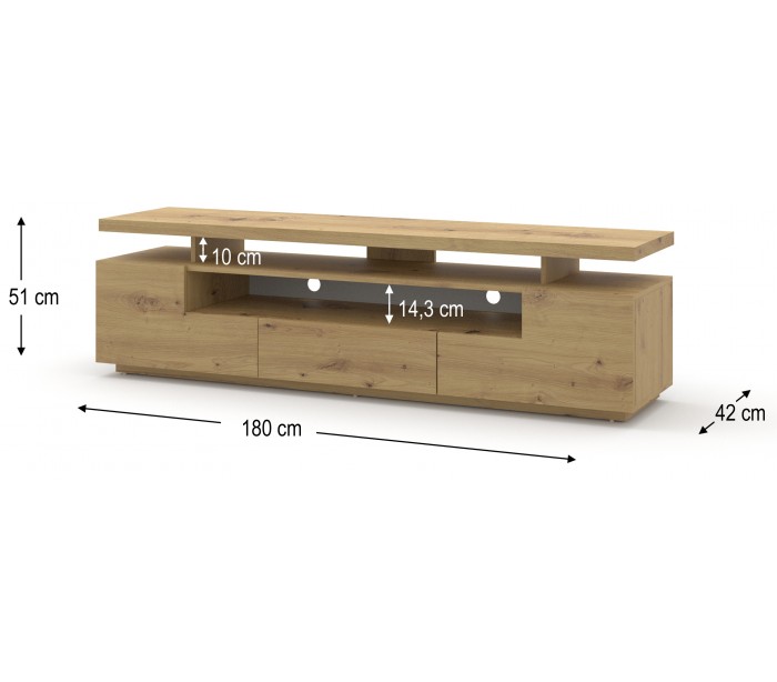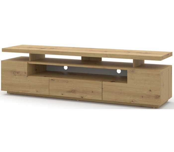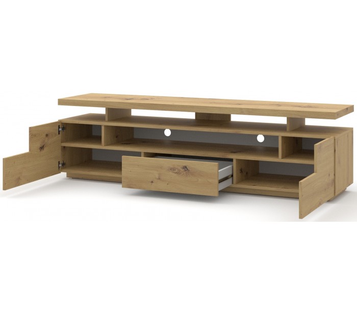 Eva tvbord udført i et design af vild egetræsfarvet møbelplade. Tvbordet måler 51 cm i højden og 180 x 42 cm i bredde og dybde. Tvbordet indeholder 1 skuffe på metalskinner, samt 2 skabe, hvert med 2 hylderum. Hertil 4 åbne hylderum.