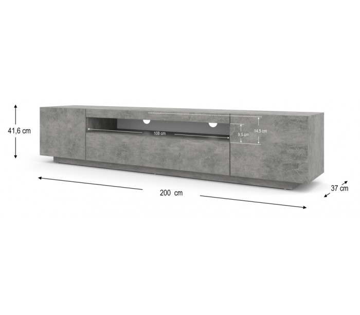 RTV tvbord udført i et design af betongrå møbelplade. Tvbordet måler 41,6 cm i højden og 200 x 37 cm i bredde og dybde. Tvbordet indeholder 3 skabe med 1 hylderum. Hertil 1 åbent hylderum. Åbent hylderum er 100 cm i bredden og 8 cm i højden.