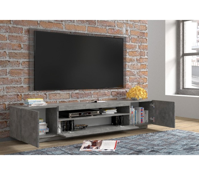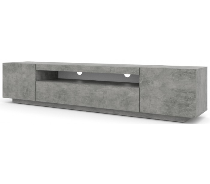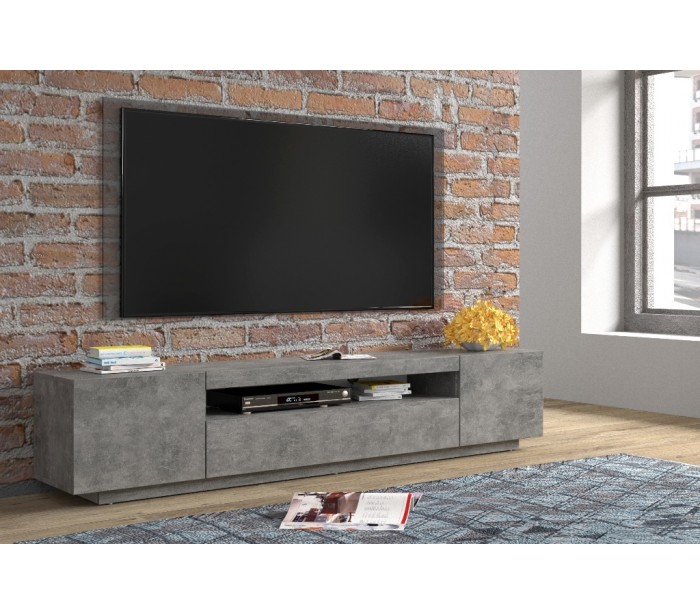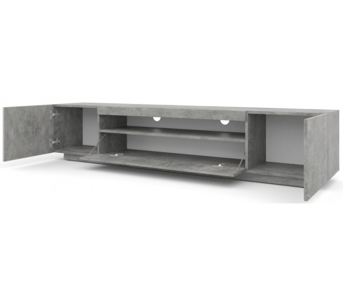 RTV tvbord udført i et design af betongrå møbelplade. Tvbordet måler 41,6 cm i højden og 200 x 37 cm i bredde og dybde. Tvbordet indeholder 3 skabe med 1 hylderum. Hertil 1 åbent hylderum.