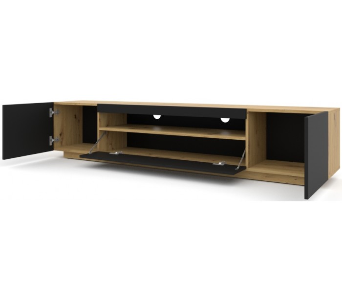 RTV tvbord udført i et design af mat sort og vild egetræsfarvet møbelplade. Tvbordet måler 41,6 cm i højden og 200 x 37 cm i bredde og dybde. Tvbordet indeholder 3 skabe med 1 hylderum. Hertil 1 åbent hylderum.