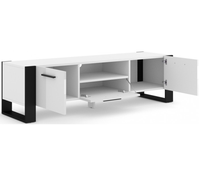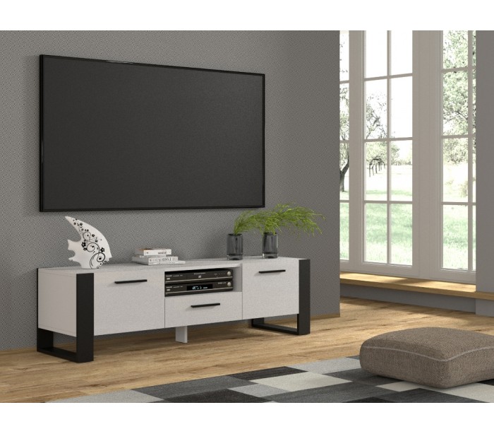 Nuka tvbord udført i et design af mat sort og hvid møbelplade. Tvbordet måler 48 cm i højden og 160 x 43 cm i bredde og dybde. Tvbordet indeholder 3 skabe med 1 hylderum. Hertil 1 åbent hylderum.
