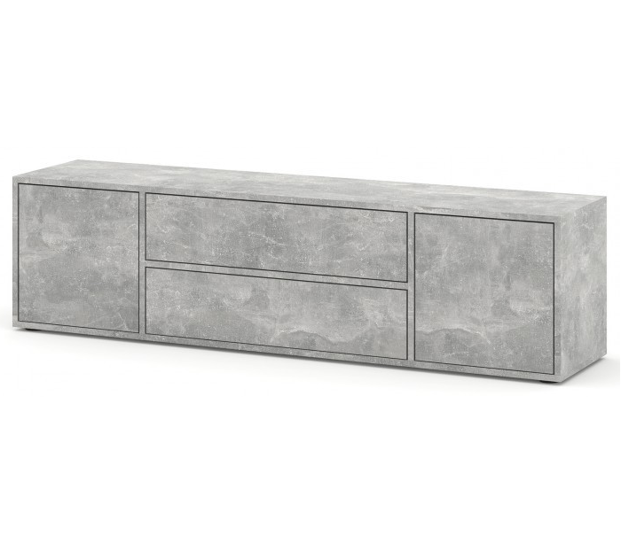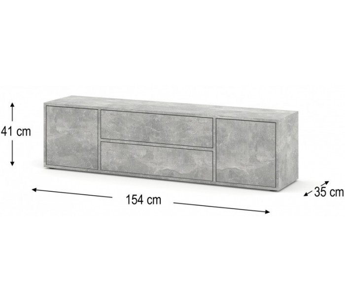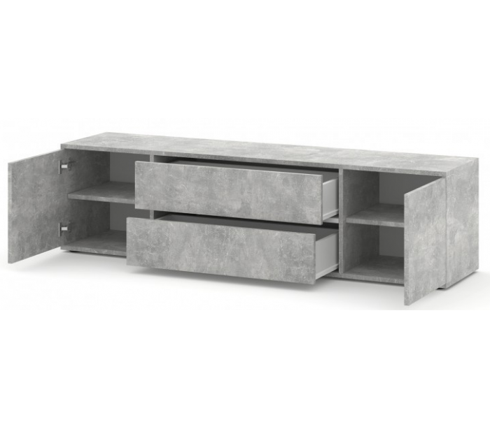 Geneva tvbord udført i et design af betongrå møbelplade. Tvbordet måler 41 cm i højden og 154 x 36 cm i bredde og dybde. Tvbordet indeholder 2 skabe, hvert med 2 hylderum. Hertil 2 skuffer.