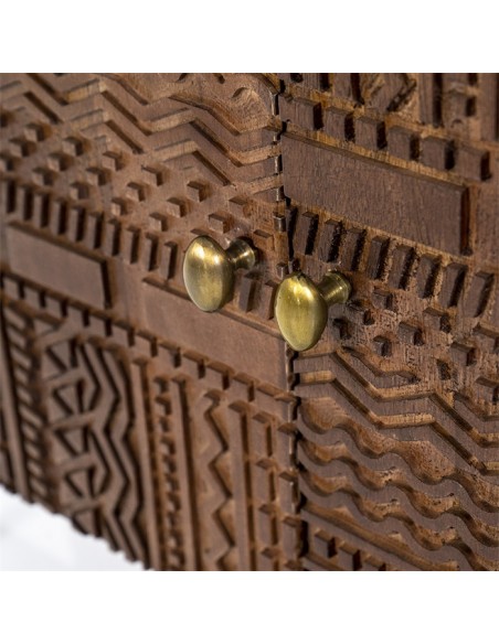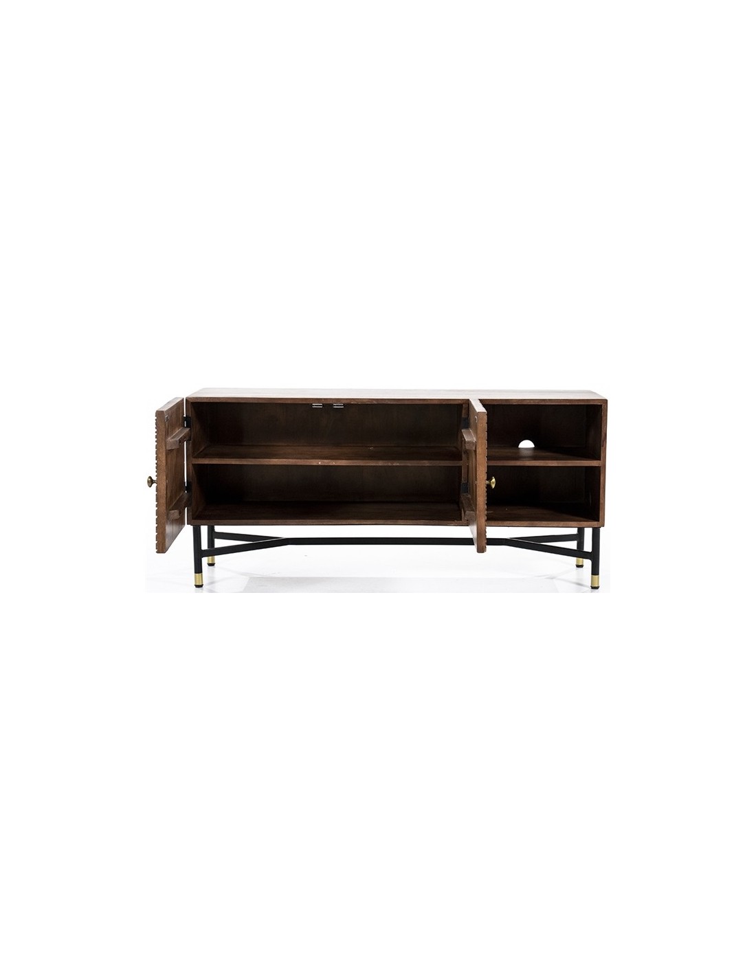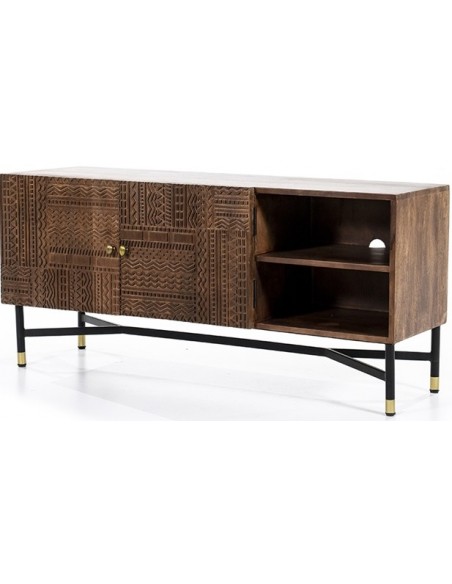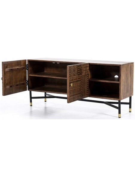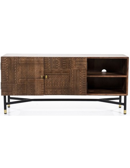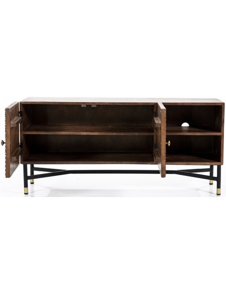 TV bord udført i et rustikt design af sortlakeret metal og mørkebrun lakeret mangotræ. TV bordet måler 130 cm i bredden og indeholder 2 åbne hylderum samt 1 dobbeltskab med 2 hylderum. TV bordet måler 60 cm i højden og 40 cm i dybden.