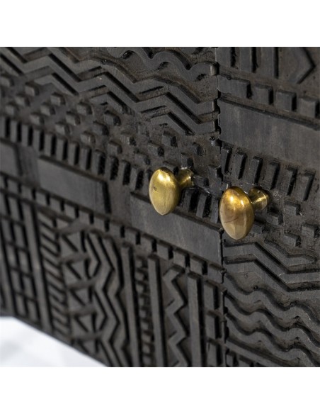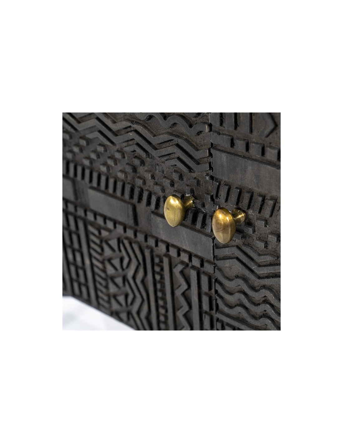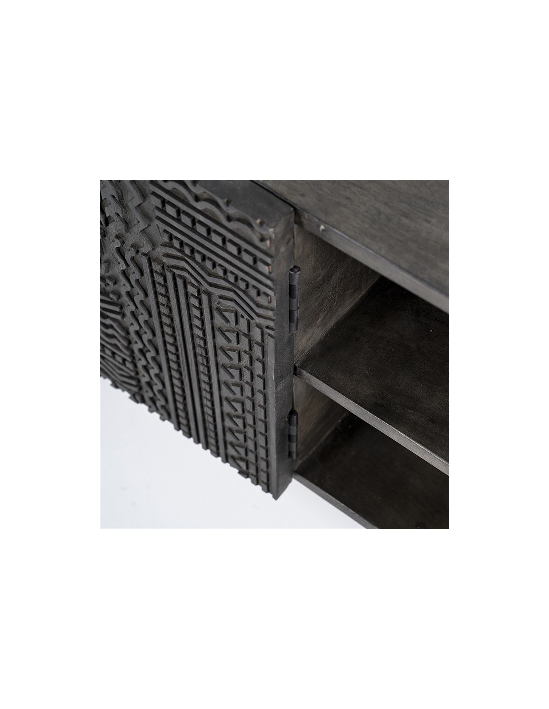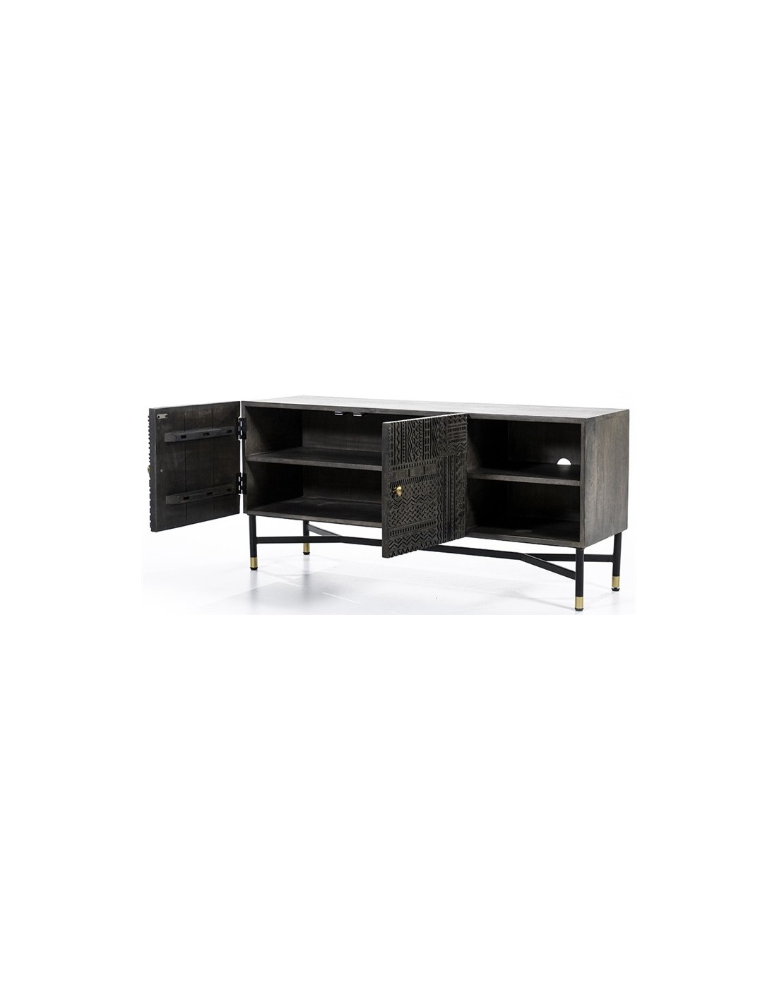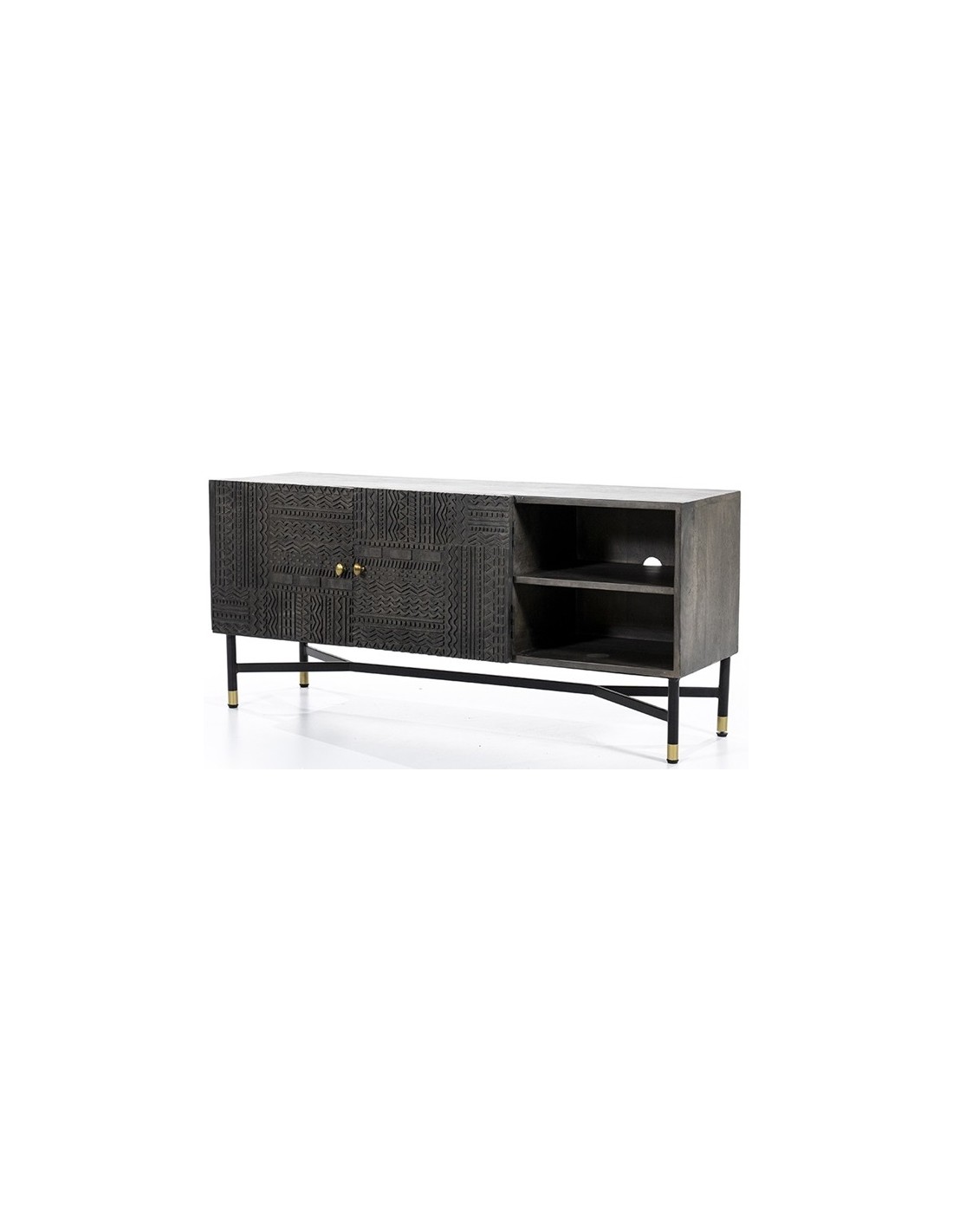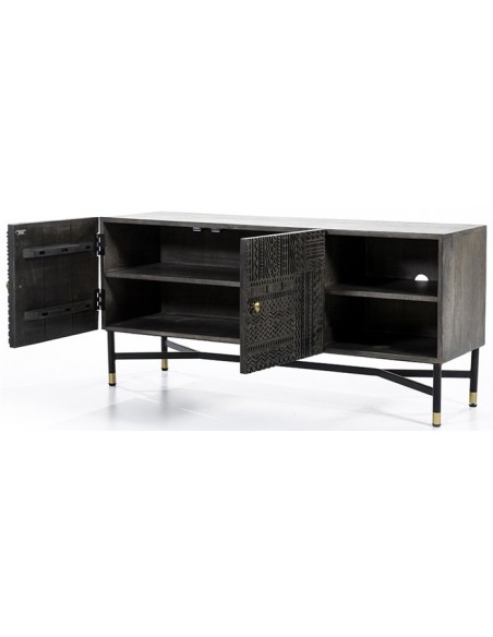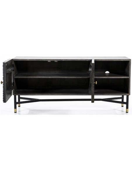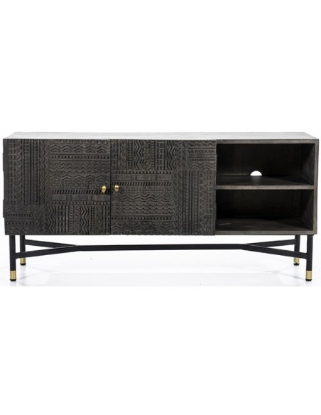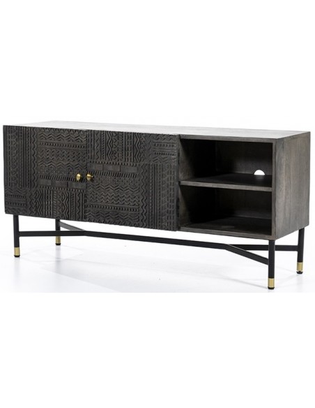 TV bord udført i et rustikt design af sortlakeret metal og mørkegrå lakeret mangotræ. TV bordet måler 130 cm i bredden og indeholder 2 åbne hylderum samt 1 dobbeltskab med 2 hylderum. TV bordet måler 60 cm i højden og 40 cm i dybden.