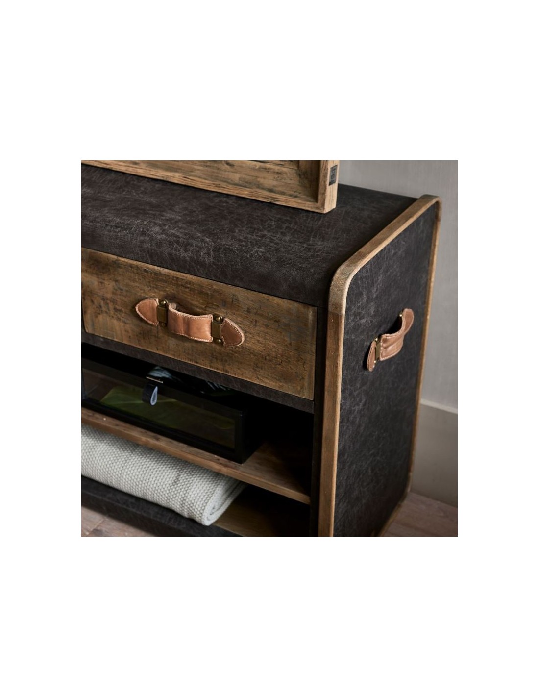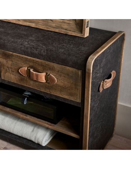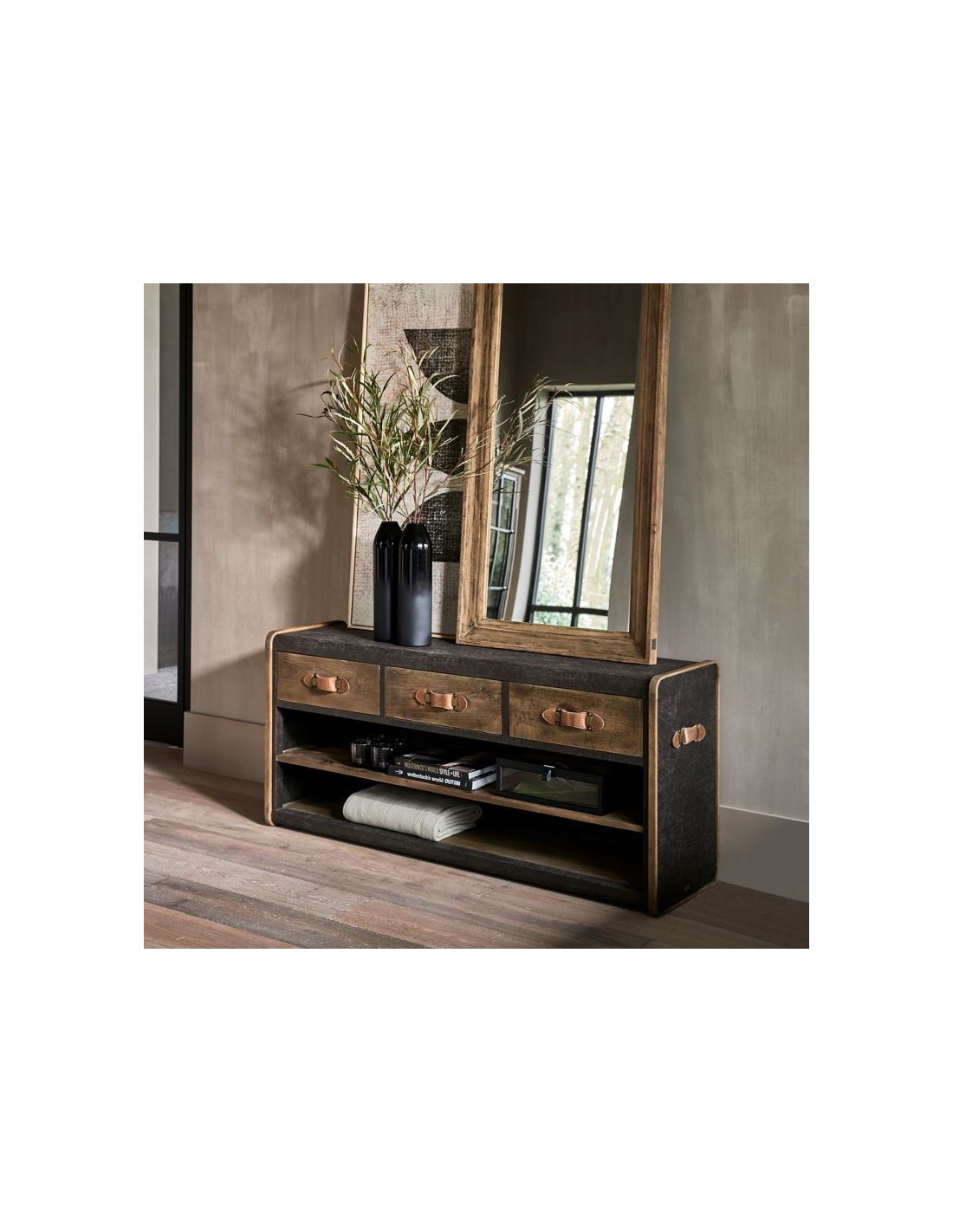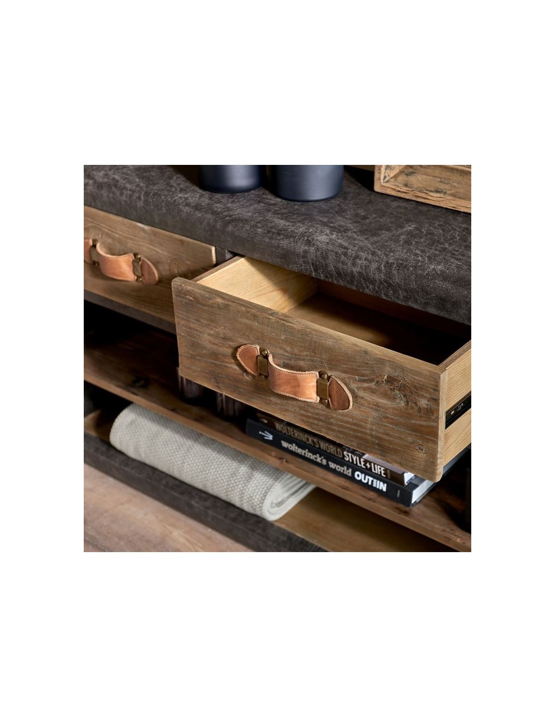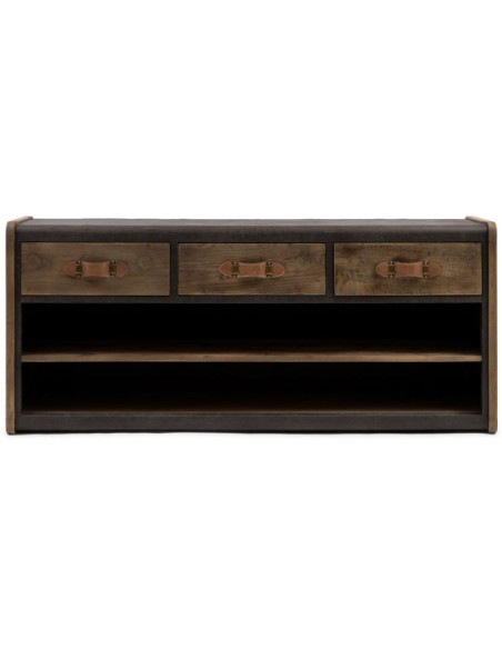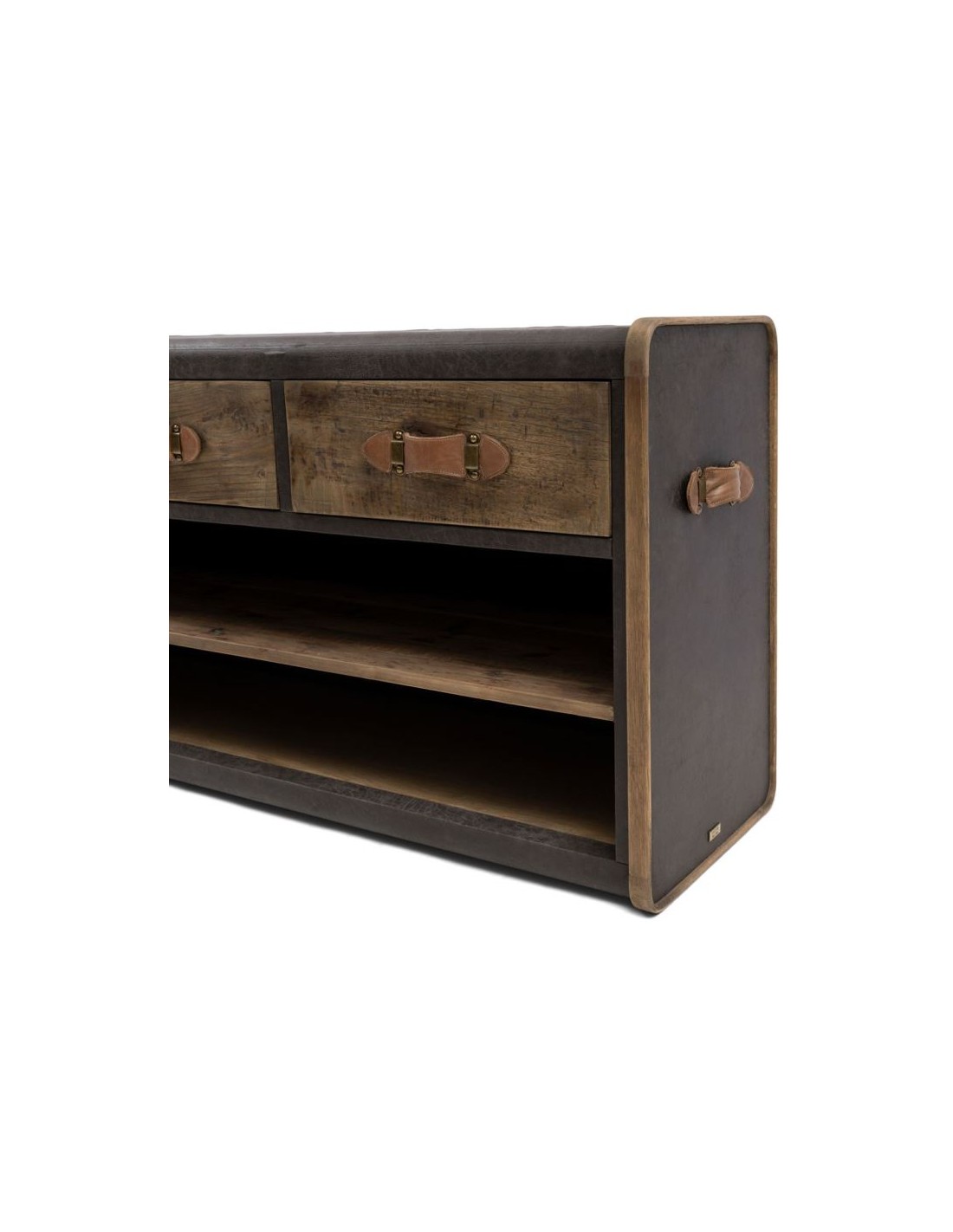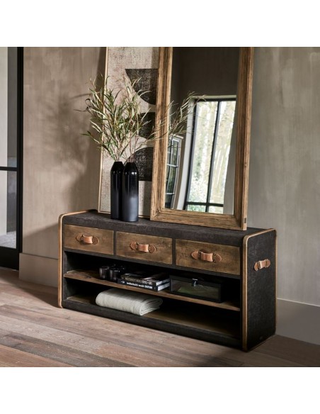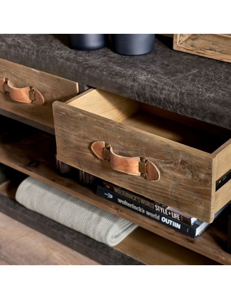 Riviera Maison tvbord i et design af genanvendt egetræ og pellini læder. Tvbordet indeholder i 3 skuffer og 2 åbne hylderum og måler 75 cm i højden og 170 cm i bredden.
