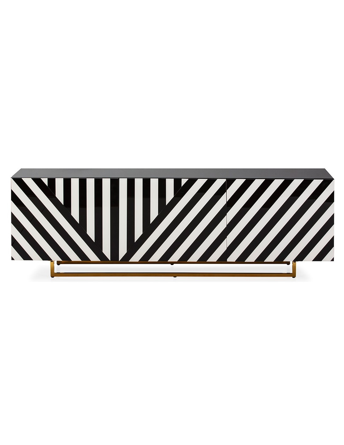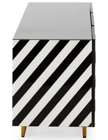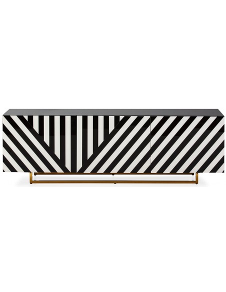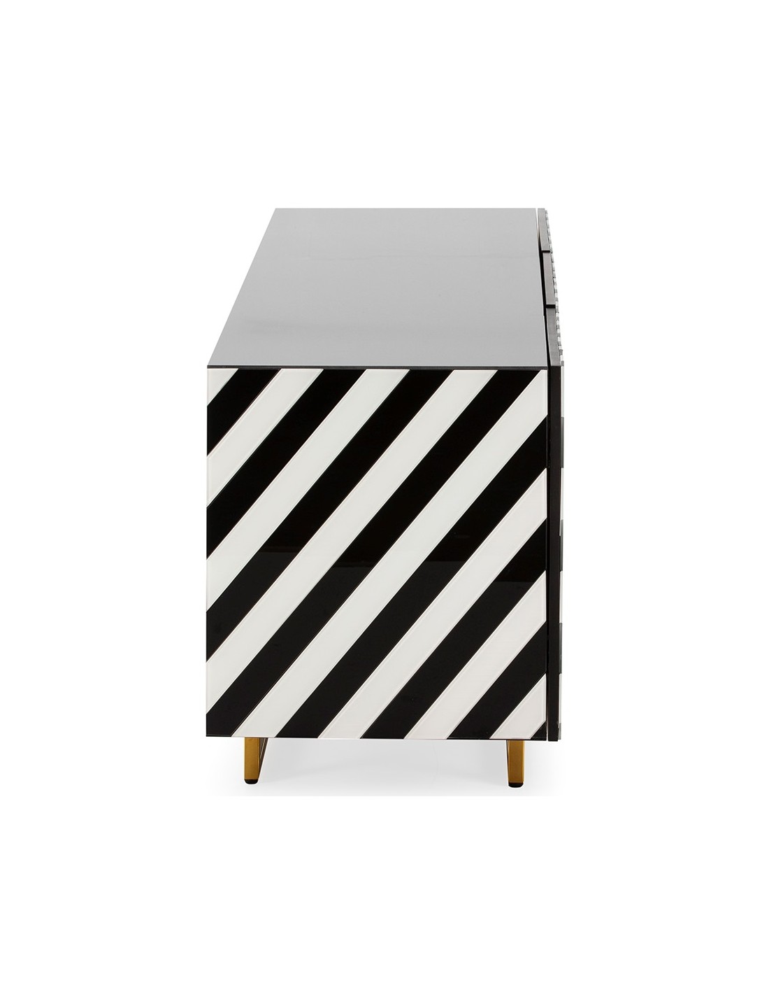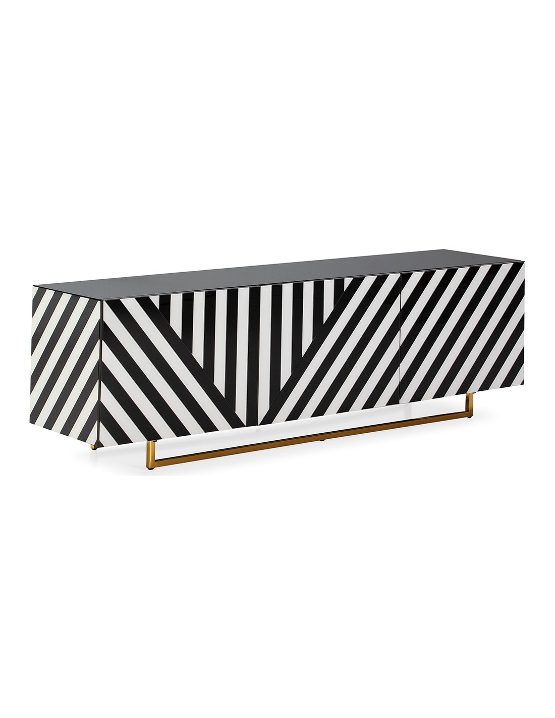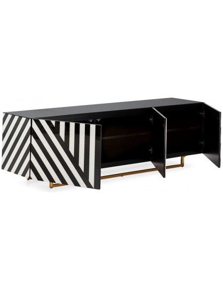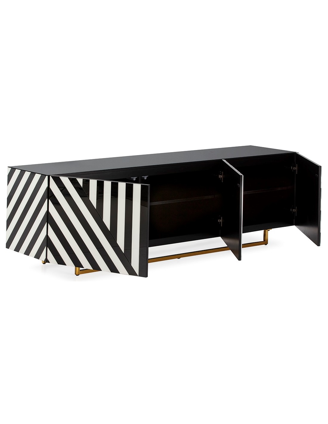 Tvbord udført i et design i antik gylden lakeret metal med kabinet i sort og hvid glas. Tvbordet måler 175 x 44 cm i bredde og dybde og 46 cm i højden. Tvbordet indeholder i alt 3 skabslåger med 2 hylderum bag hver.