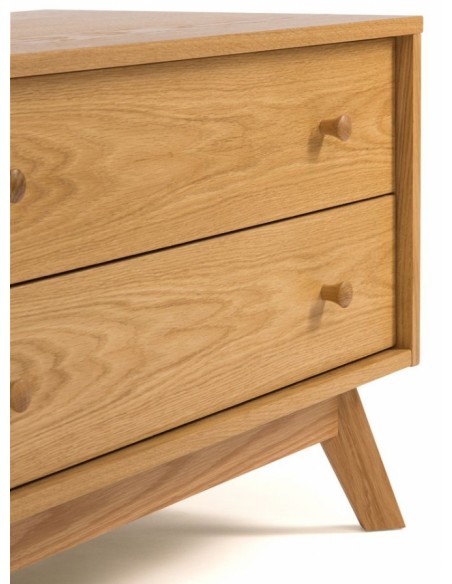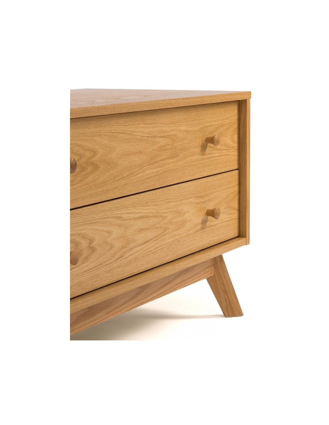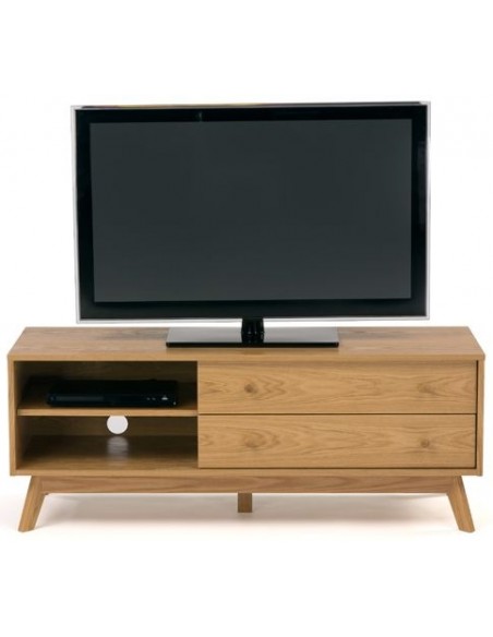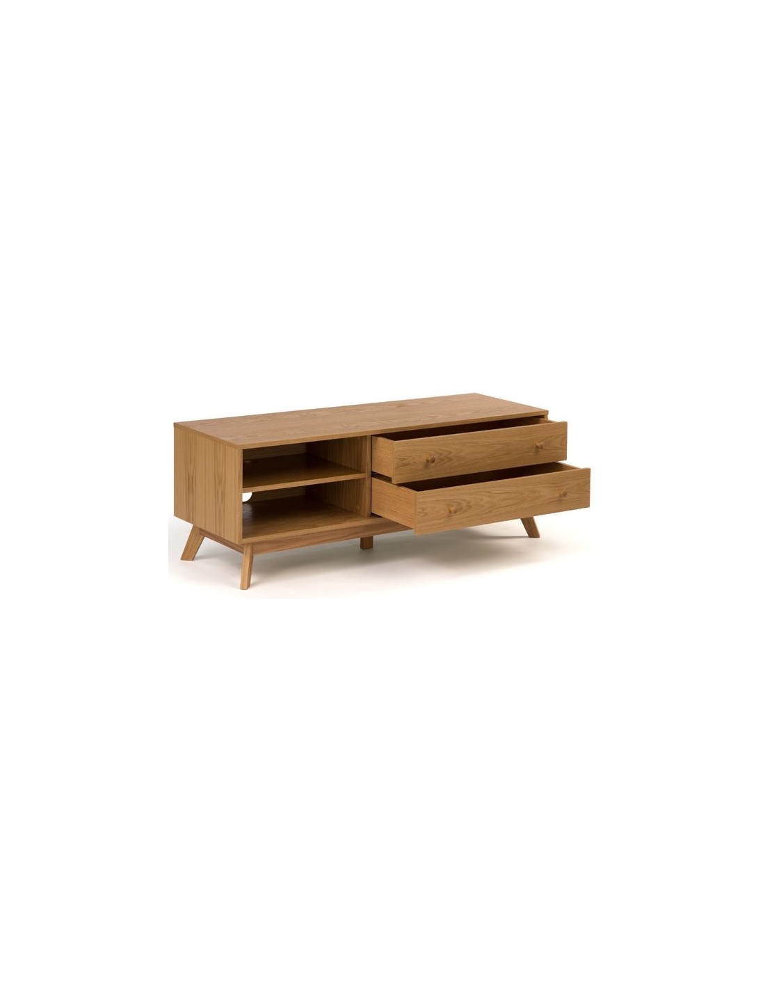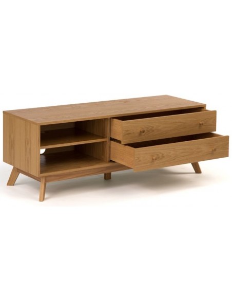 Kensal tvbord udført i et moderne design med 2 skuffer og 2 åbne hylderum. Tvbordet er fremstillet i egetræ og egetræsfinér.