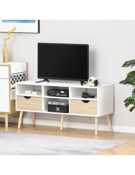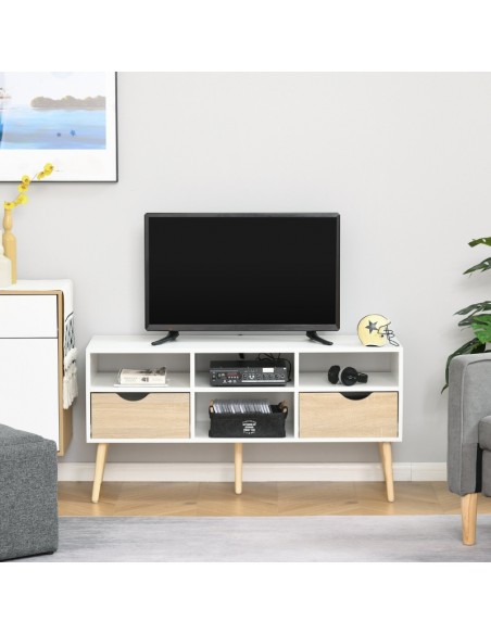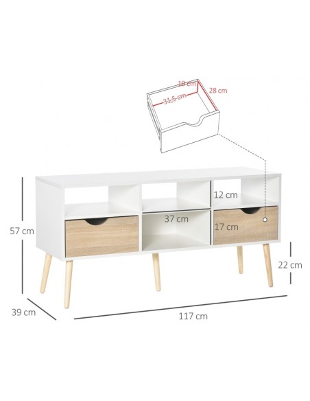 TV Bord udført i et design af møbelplade og træ. TV Bordet måler 117 x 39 cm i bredde og dybde og 57 cm i højden. Møblet indeholder 4 åbne hylderum samt 2 skuffer.