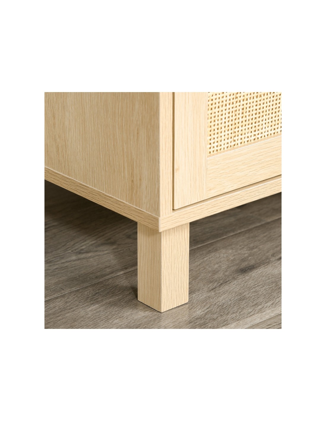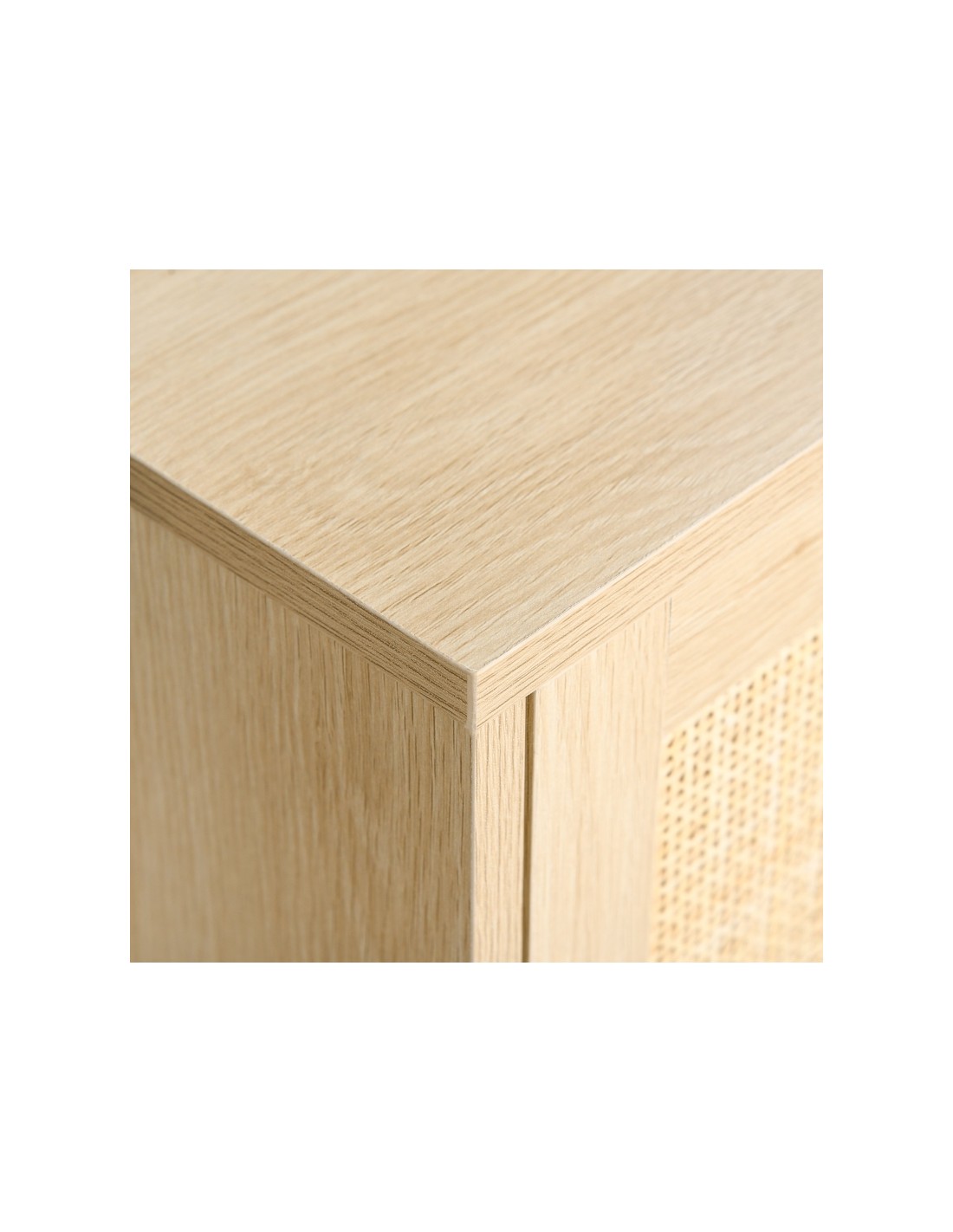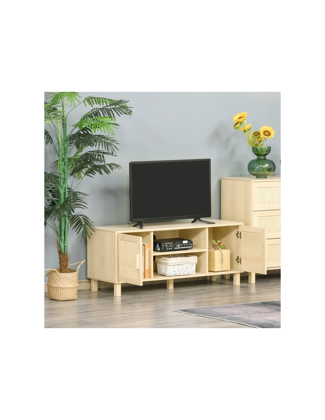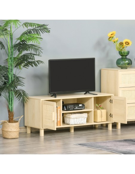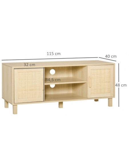TV Bord udført i et design af MDF og rattanflet. TV Bordet måler 115 x 40 cm i bredde og dybde og 48 cm i højden. Møblet indeholder 2 åbne hylderum samt 2 skabe.