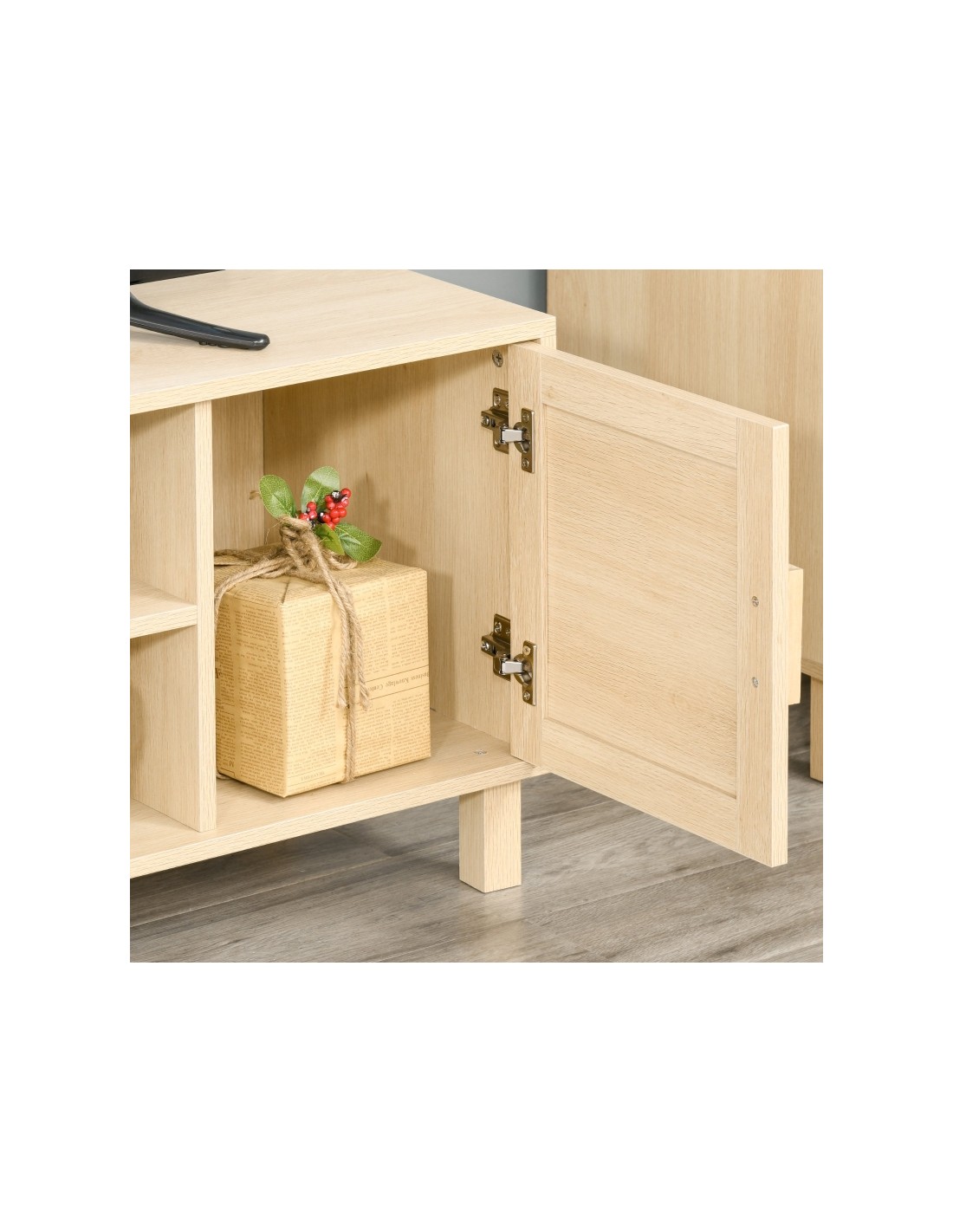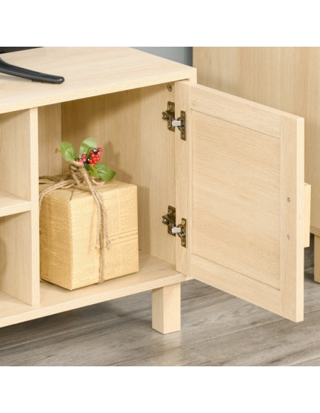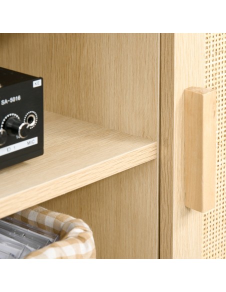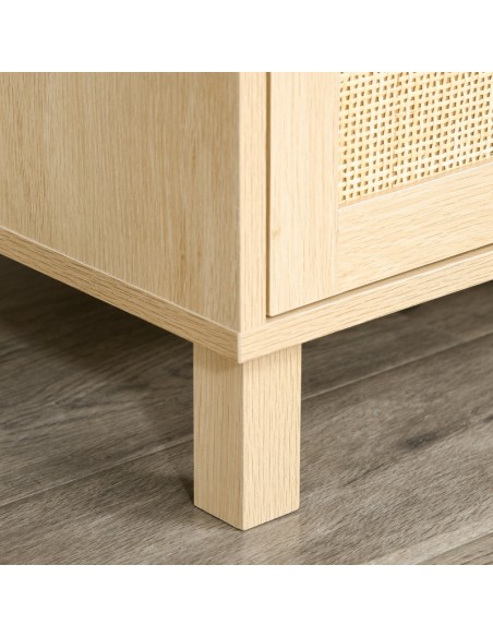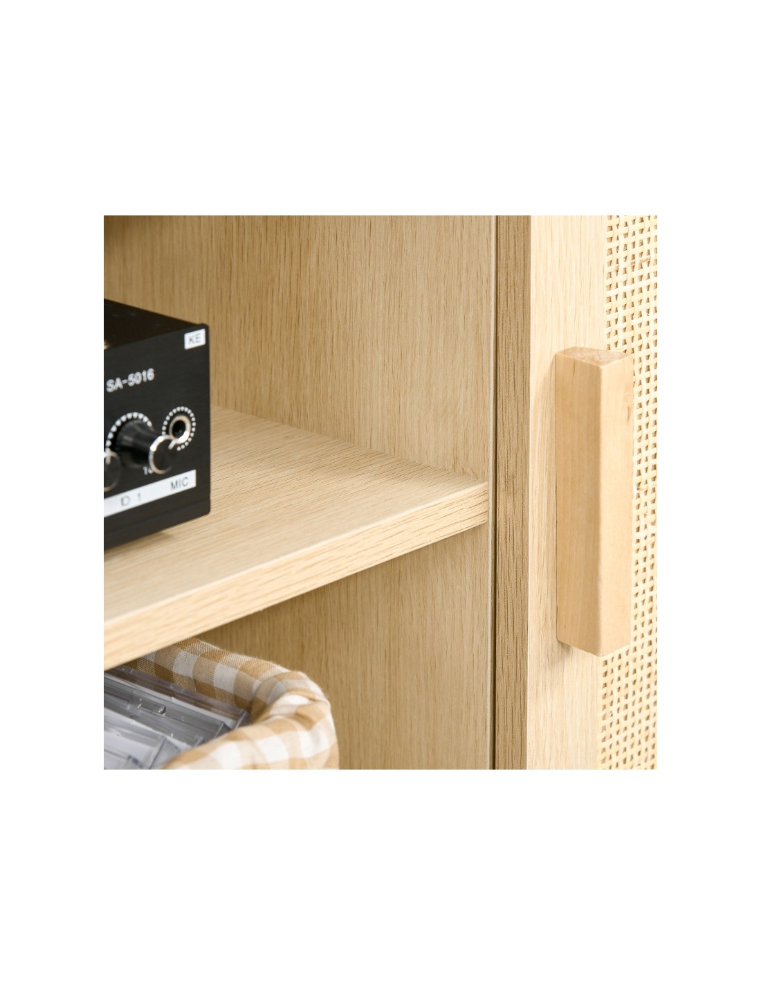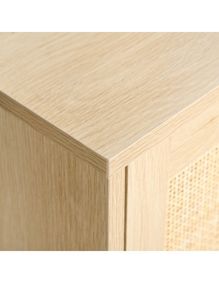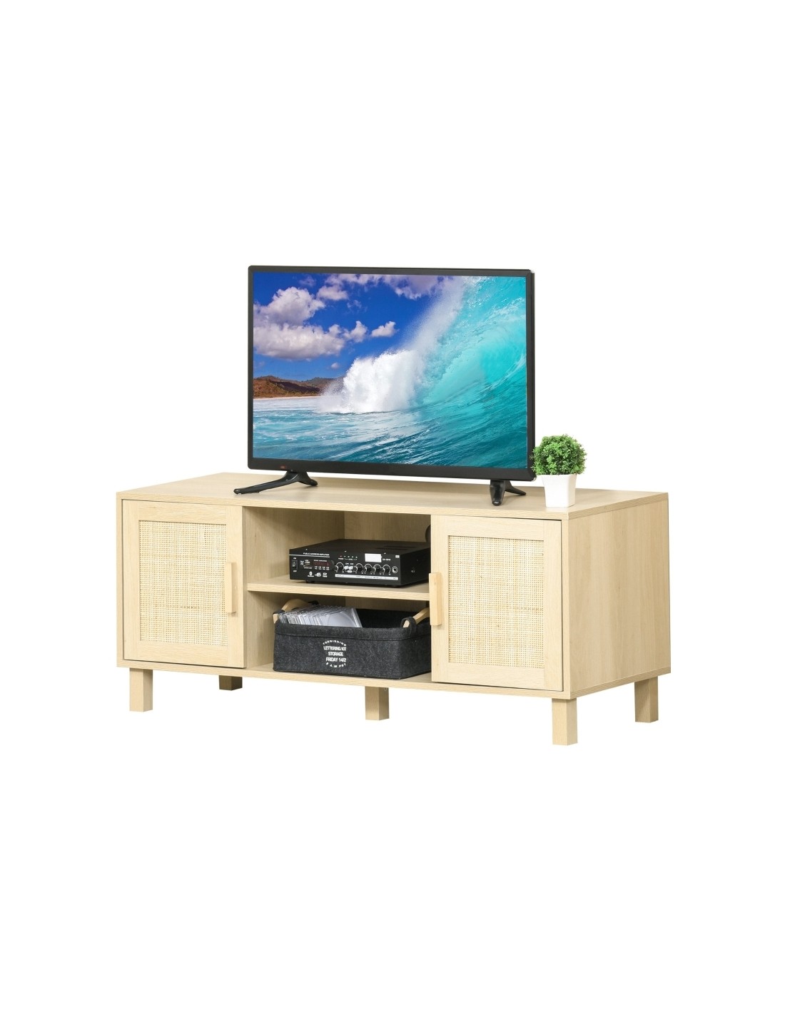 TV Bord udført i et design af MDF og rattanflet. TV Bordet måler 115 x 40 cm i bredde og dybde og 48 cm i højden. Møblet indeholder 2 åbne hylderum samt 2 skabe.