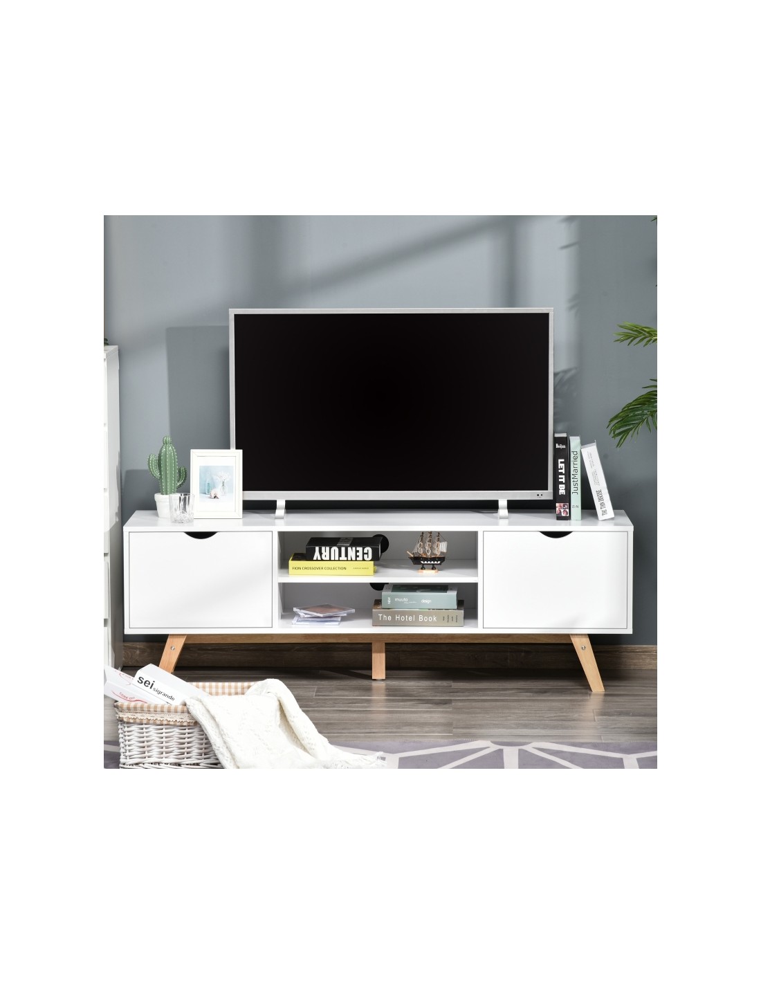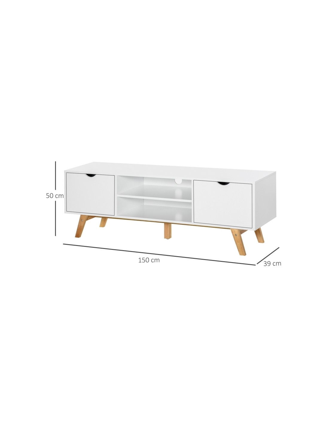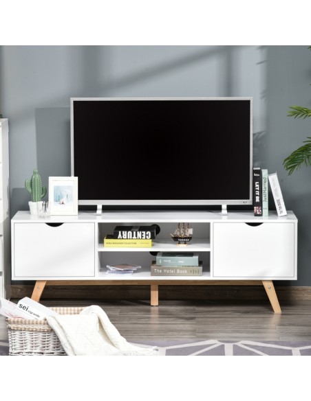 TV Bord udført i et design af møbelplade og træ. TV Bordet måler 150 x 39 cm i bredde og dybde og 50 cm i højden. Møblet indeholder 2 skabe og 2 åbne hylderum.