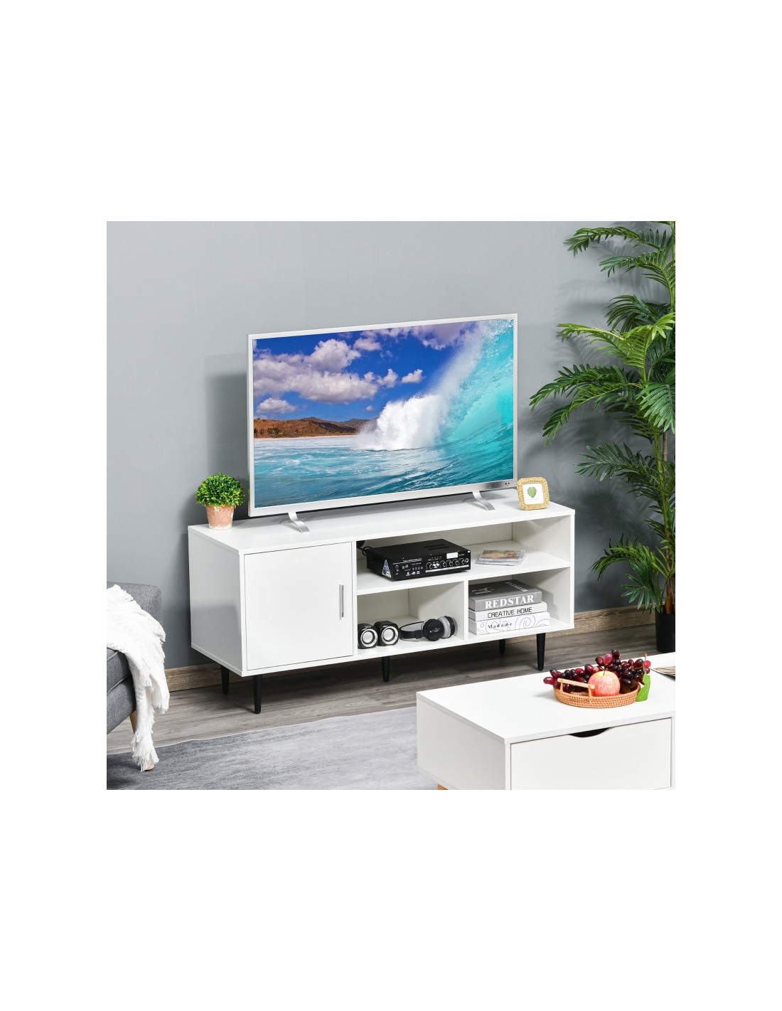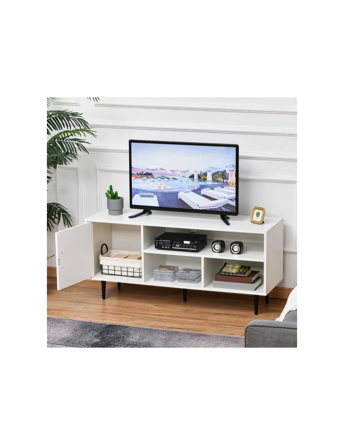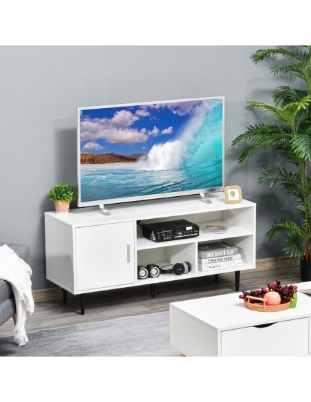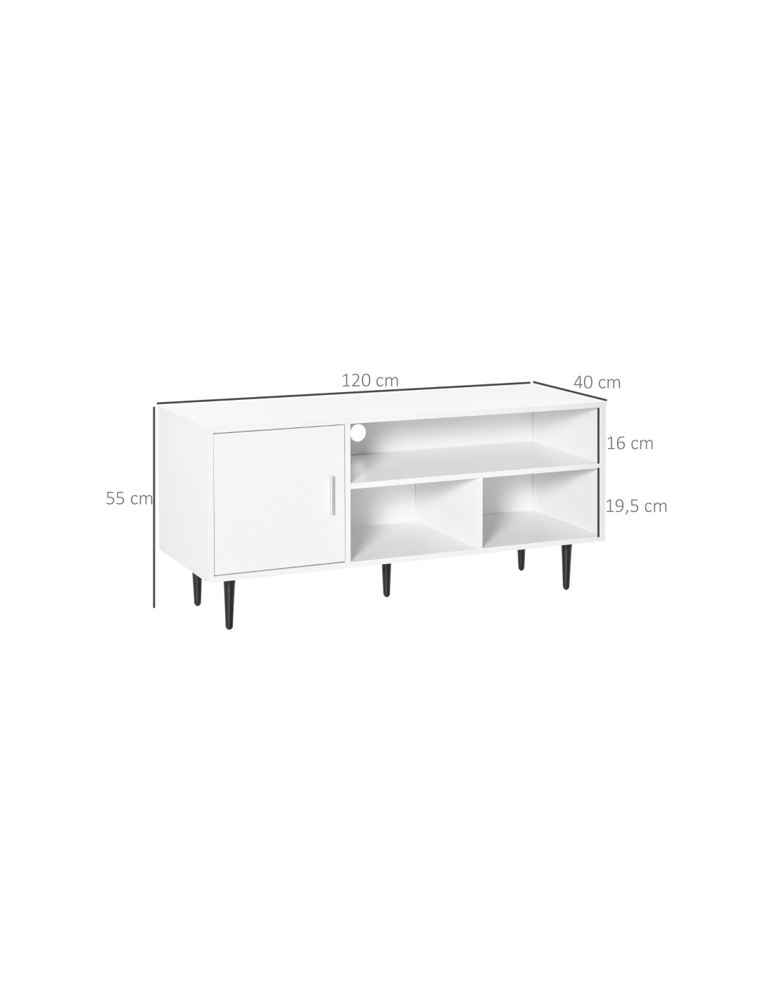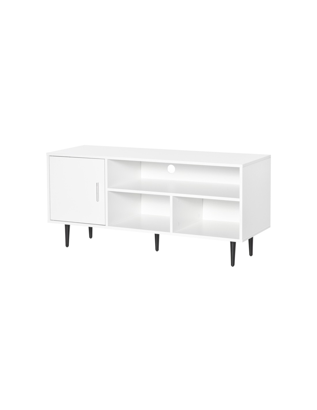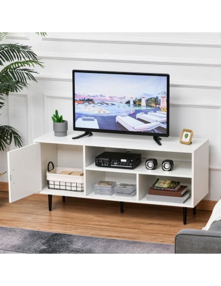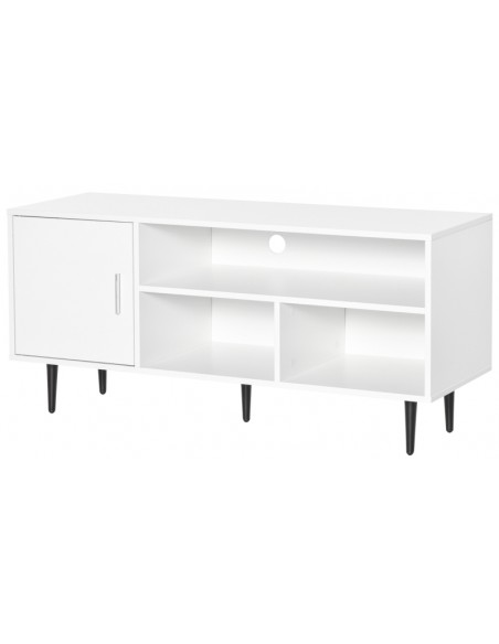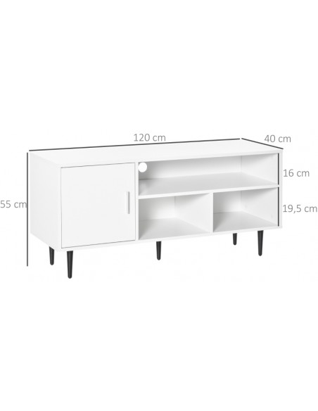 TV Bord udført i et design af møbelplade og metal. TV Bordet måler 120 x 40 cm i bredde og dybde og 55 cm i højden. Møblet indeholder 3 åbne hylderum og 1 skab.
