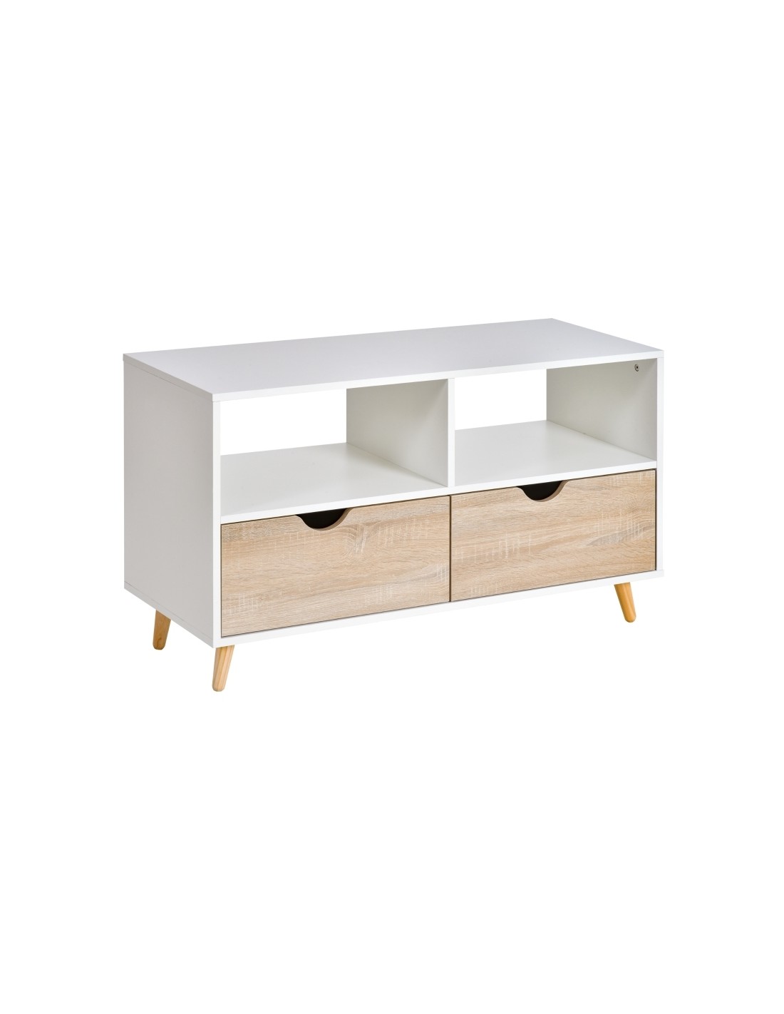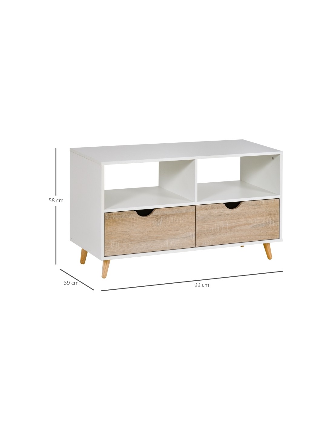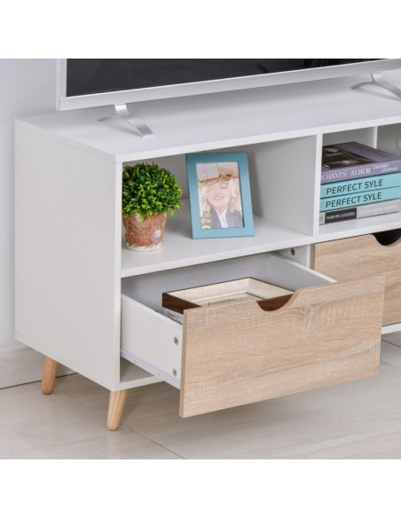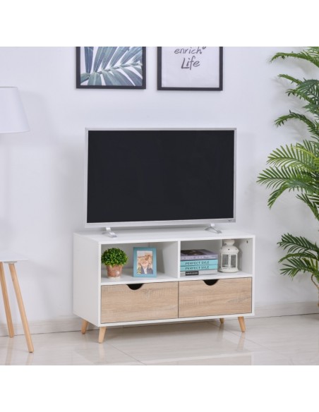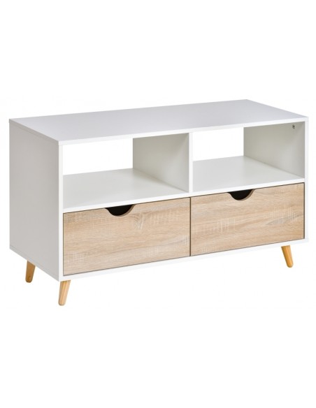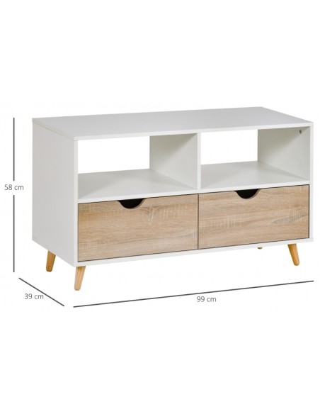 TV Bord udført i et design af møbelplade og træ. TV Bordet måler 99 x 39 cm i bredde og dybde og 58 cm i højden. Møblet indeholder 2 åbne hylderum samt 2 skuffer.