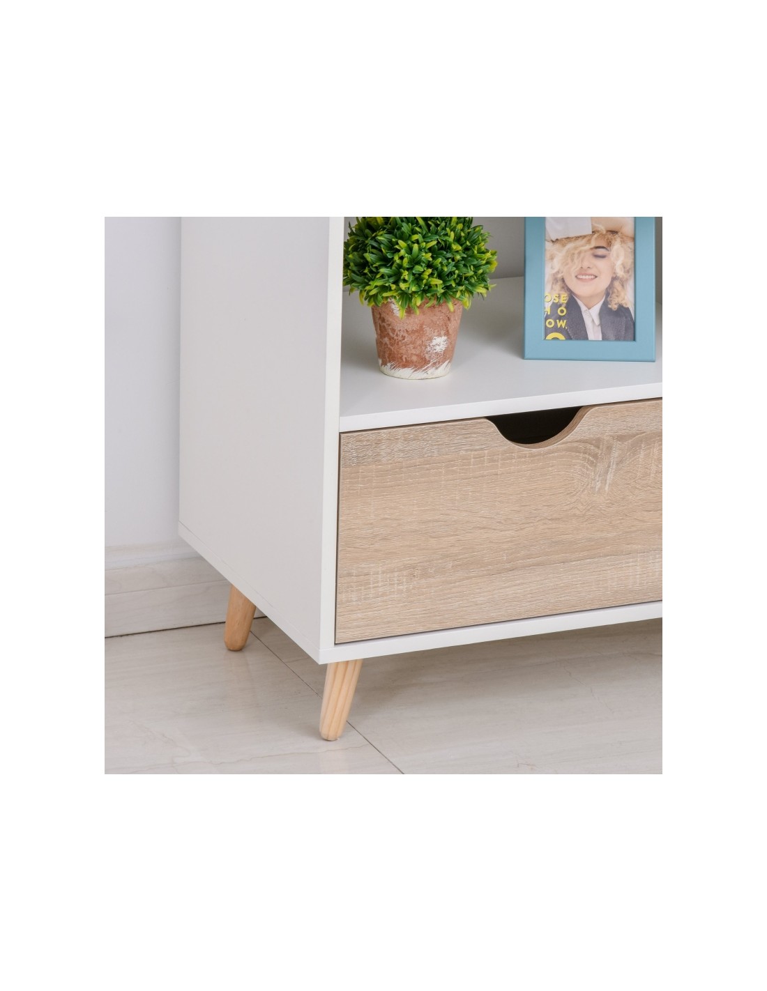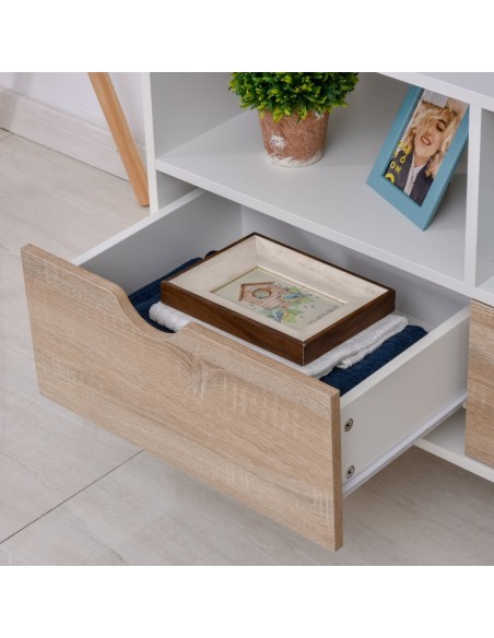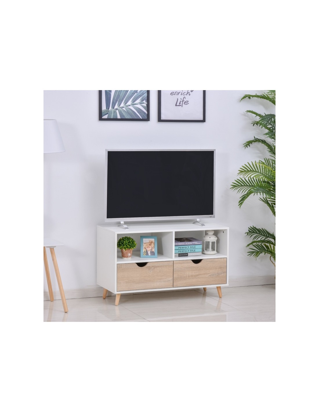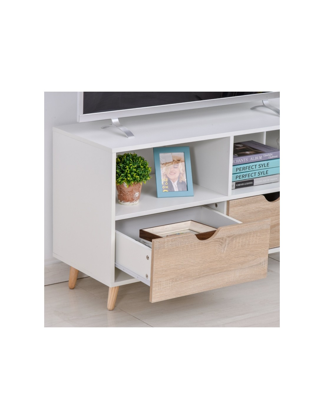 TV Bord udført i et design af møbelplade og træ. TV Bordet måler 99 x 39 cm i bredde og dybde og 58 cm i højden. Møblet indeholder 2 åbne hylderum samt 2 skuffer.