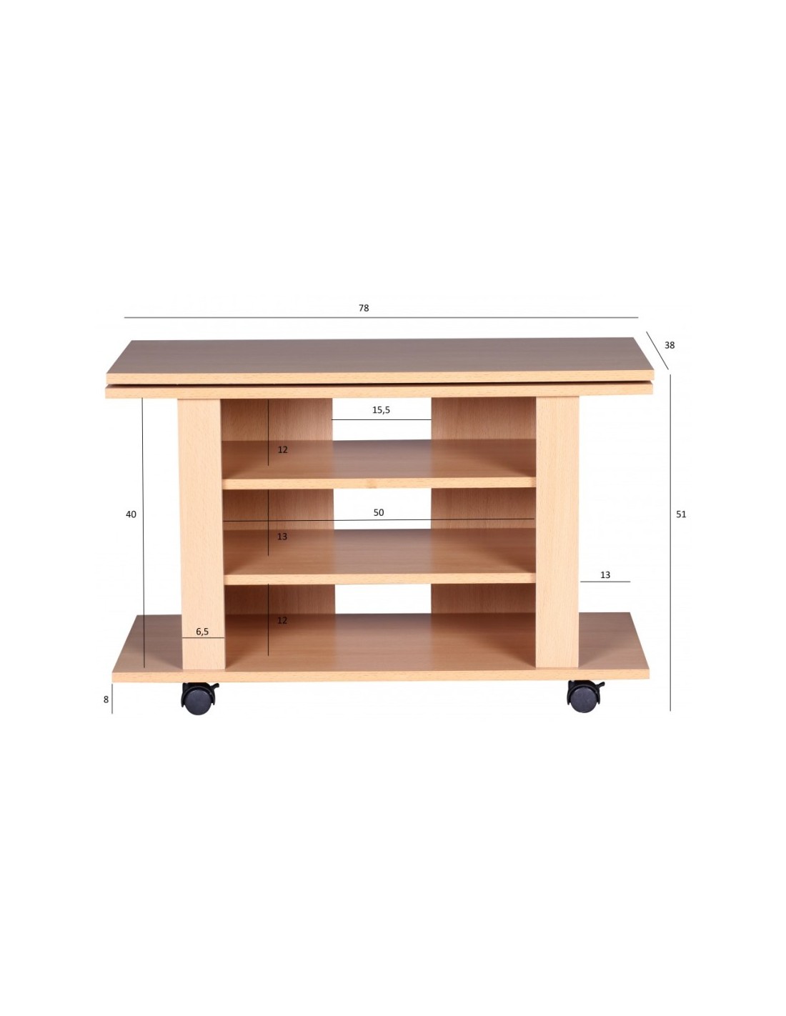 Tvbord fremstillet i et design af bøgetræsfarvet møbelplade. Tvbordet måler 51 cm i højden og 78 x 38 cm i bredde og dybde.