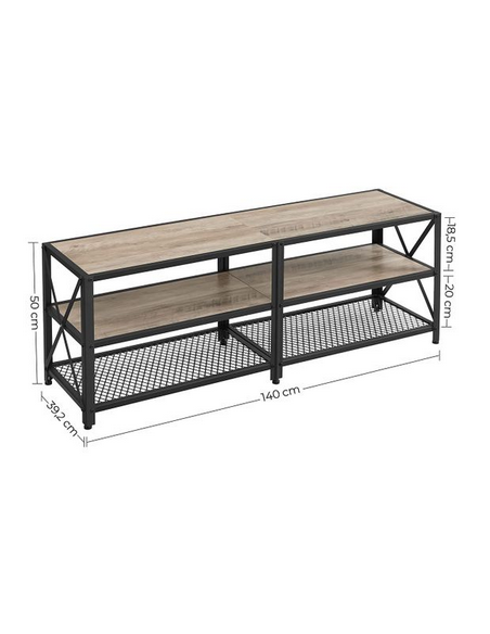 Tvbord udført i et design af sortlakeret metal og grå møbelplade. Tvbordet måler 50 cm i højden og 140 x 39,2 cm i bredde og dybde.