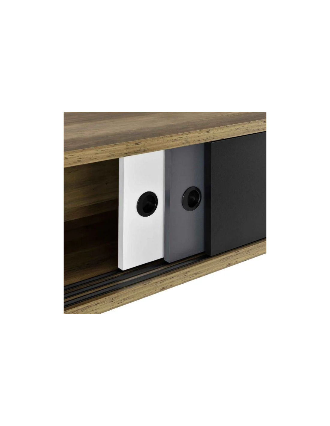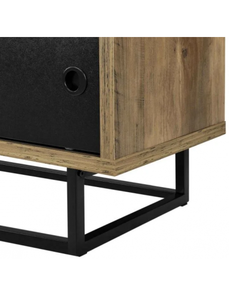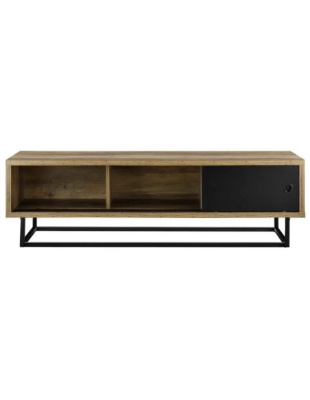 Tvbord udført i et design af sortlakeret metal og mørk naturfarvet møbelplade. Tvbordet måler 41 cm i højden og 140 x 35 cm i bredde og dybde. Tvbordet har skydelåger.