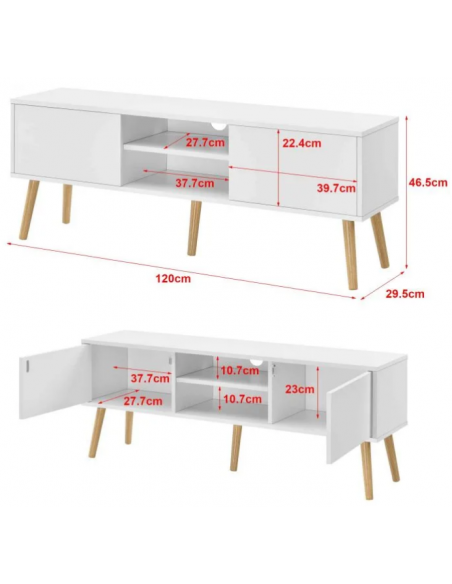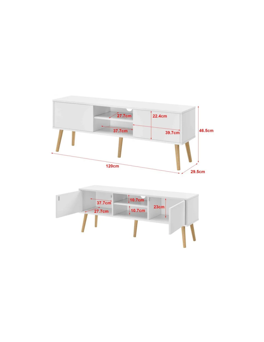 Tvbord udført i et design af træ og møbelplade. Tvbordet måler 46,5 cm i højden og 120 x 29,5 cm i bredde og dybde.