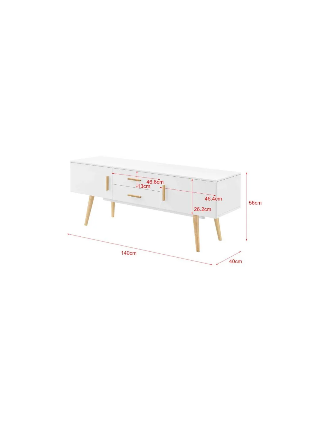 Tvbord udført i et design af træ og møbelplade. Tvbordet måler 56 cm i højden og 140 x 40 cm i bredde og dybde.