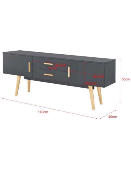 Tvbord udført i et design af træ og møbelplade. Tvbordet måler 56 cm i højden og 140 x 40 cm i bredde og dybde.