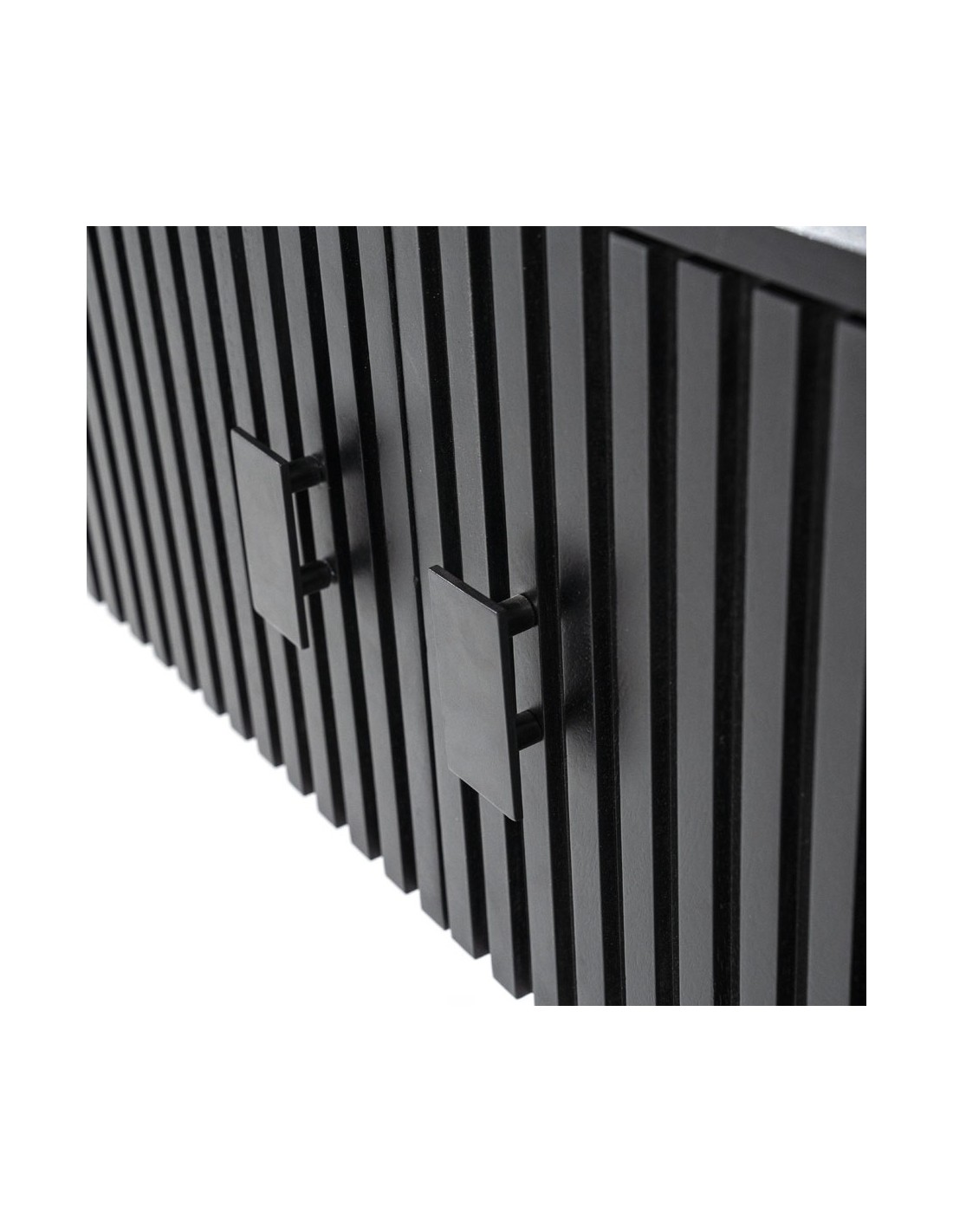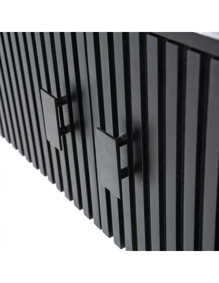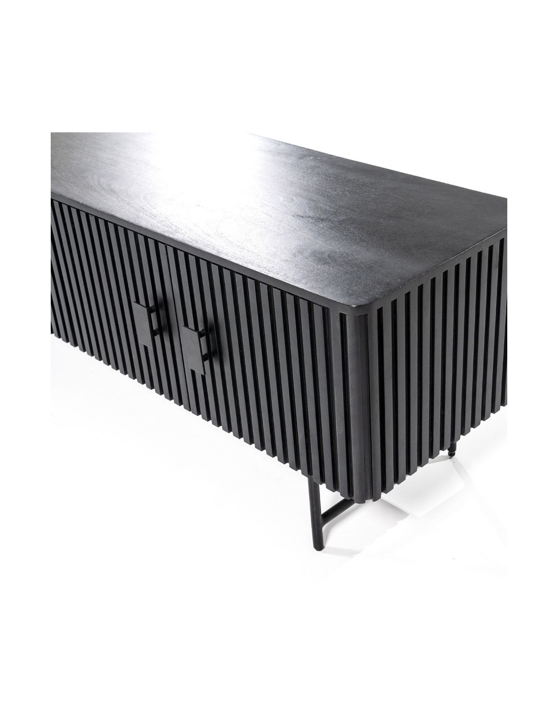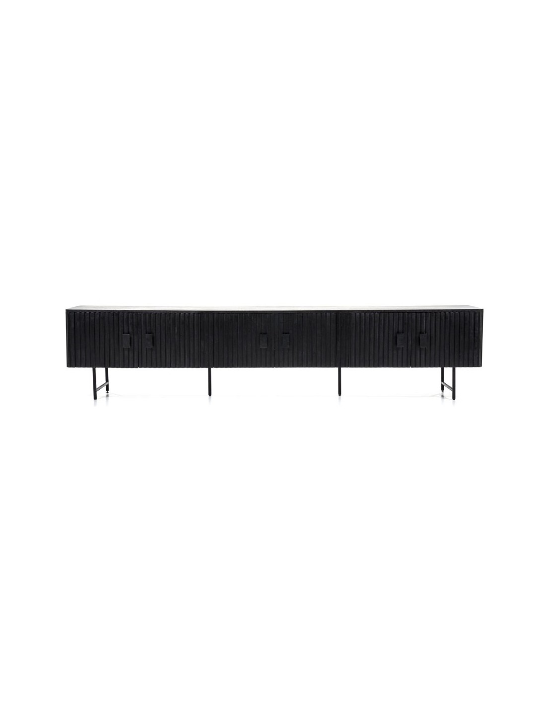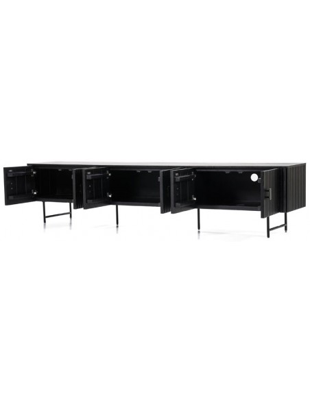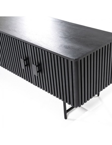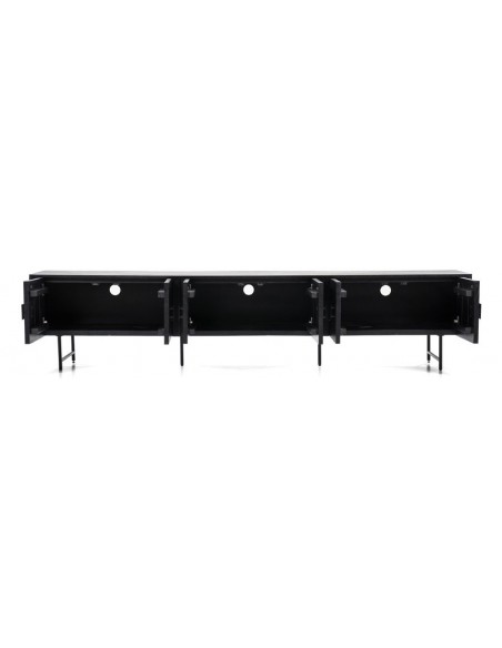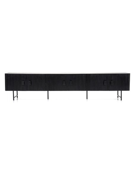TV bord udført i et rustikt design af sortlakeret metal og sortlakeret mangotræ. Tvbordet måler 56 cm i højden og 250 x 45 cm i bredde og dybde. Tvbordet indeholder 3 dobbeltskabe, hvert med 1 hylderum.