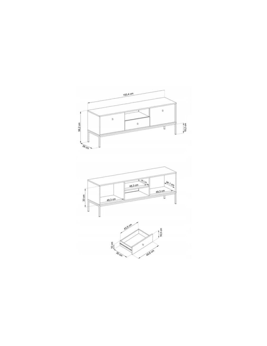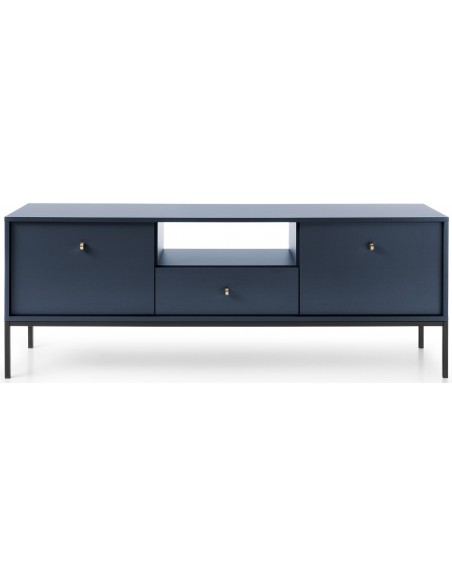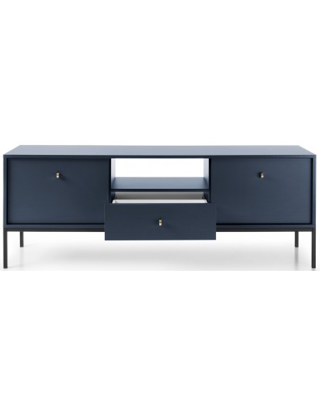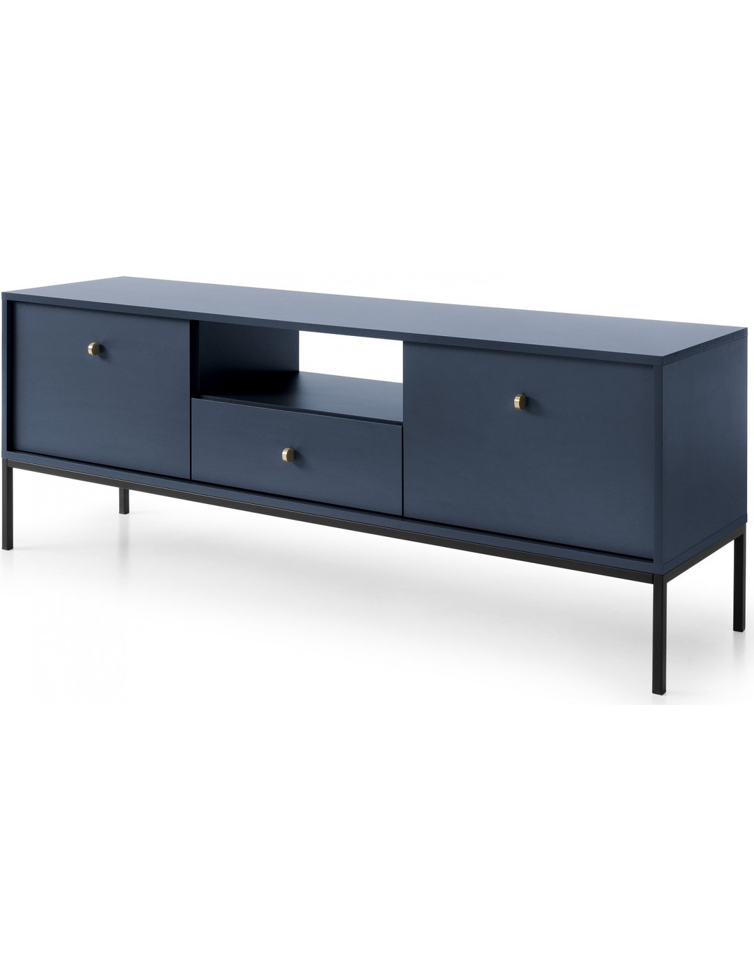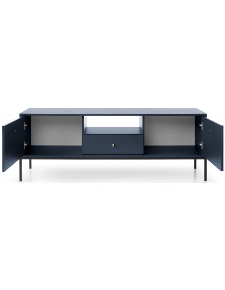 Mono tvbord udført i et design af sortlakeret metal og navyblå møbelplade. Tvbordet måler 56 cm i højden og 153 x 39 cm i bredde og dybde. Tvbordet indeholder 2 skabe samt 1 skuffe og 1 åbent hylderum.