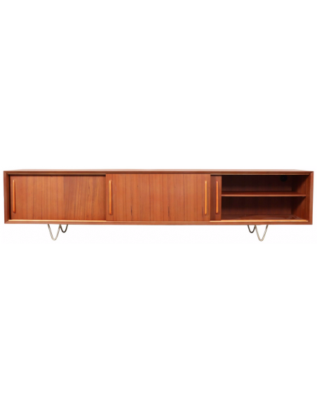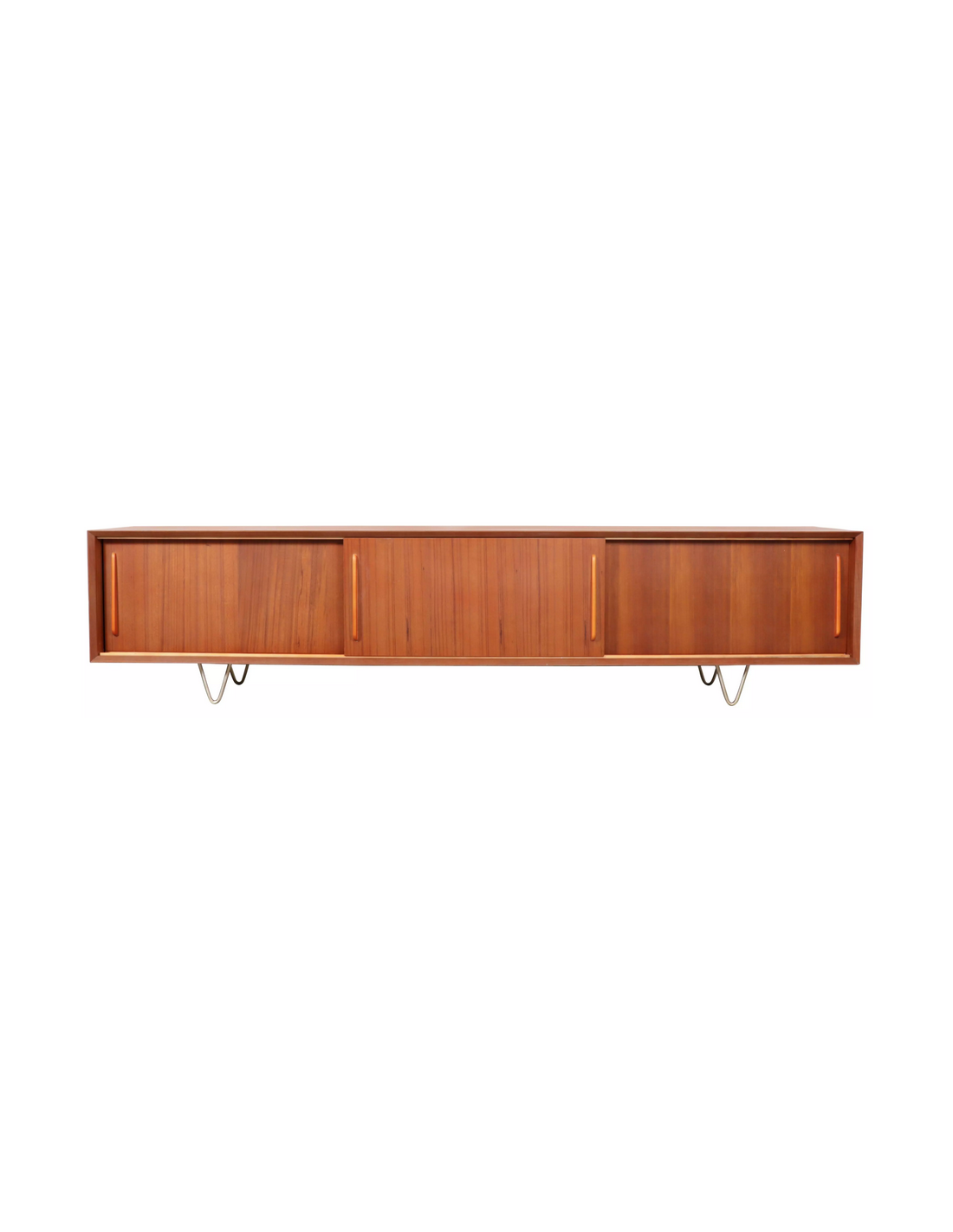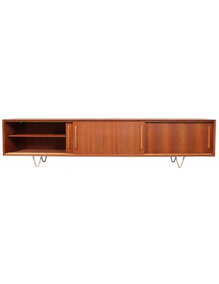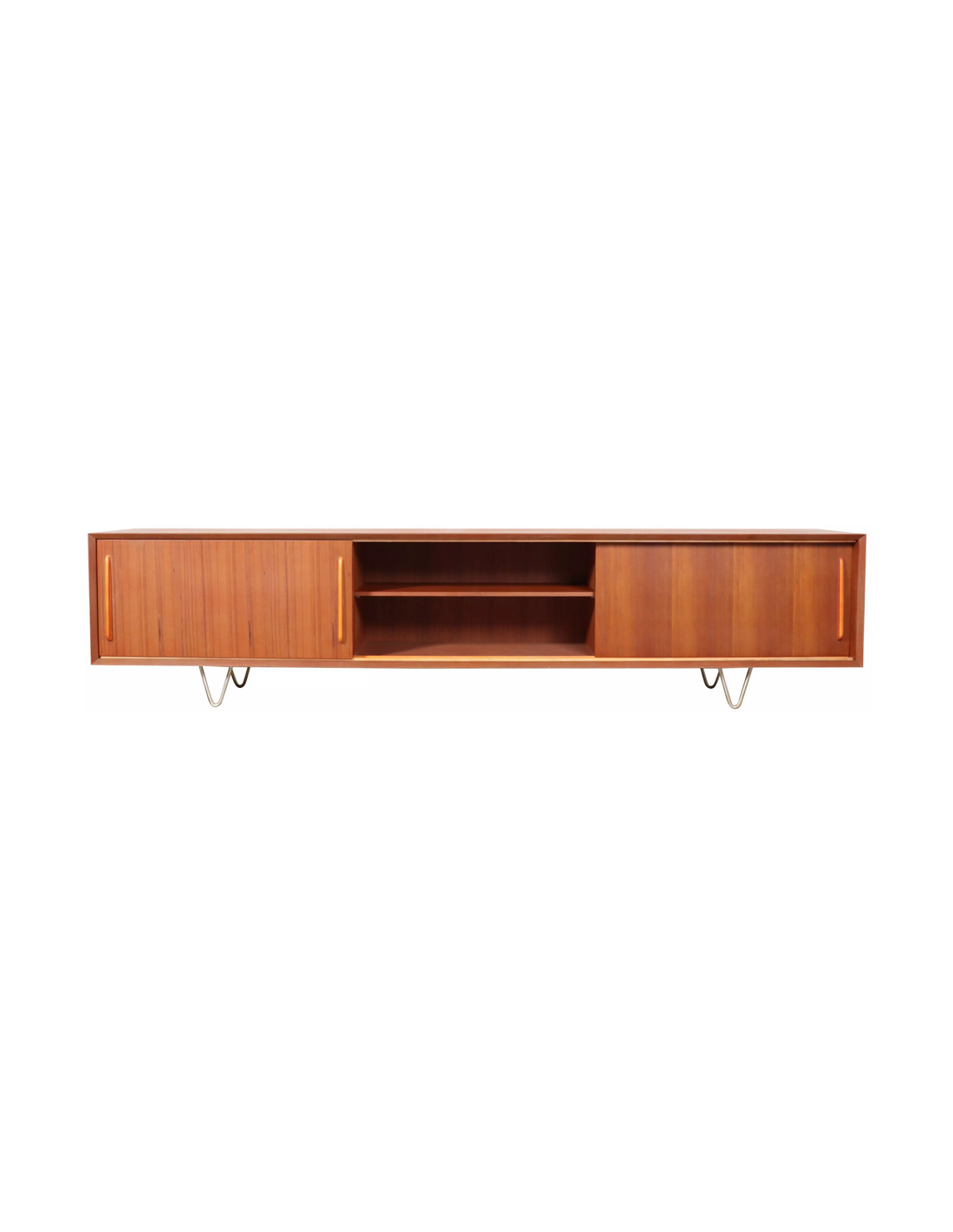 Tvbord udført i et design af guldfarvet metal og teaktræsfinér. Tvbordet har justérbare hylder i hvert af de 3 rum, samt skydelåger. Møblet måler 51 cm i højden og 220 x 45 cm i bredde og dybde.