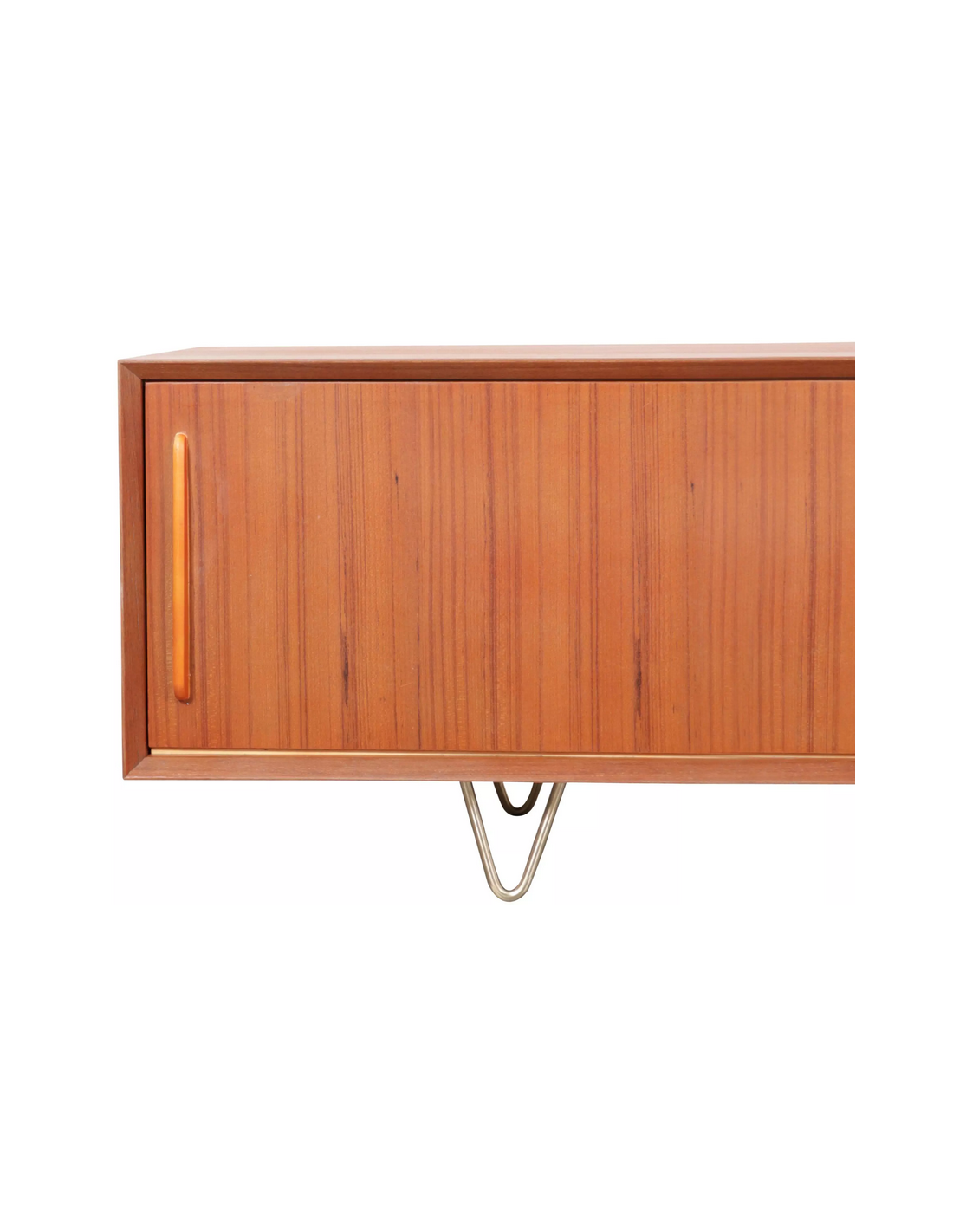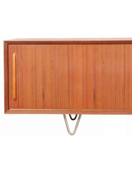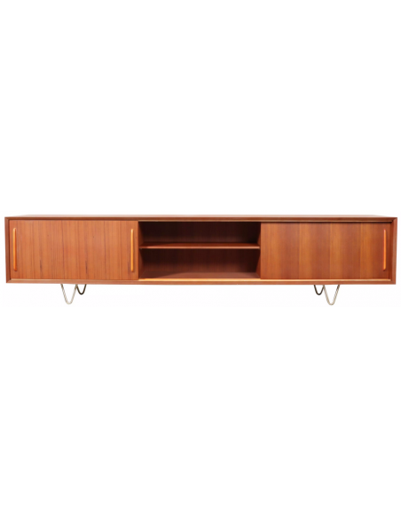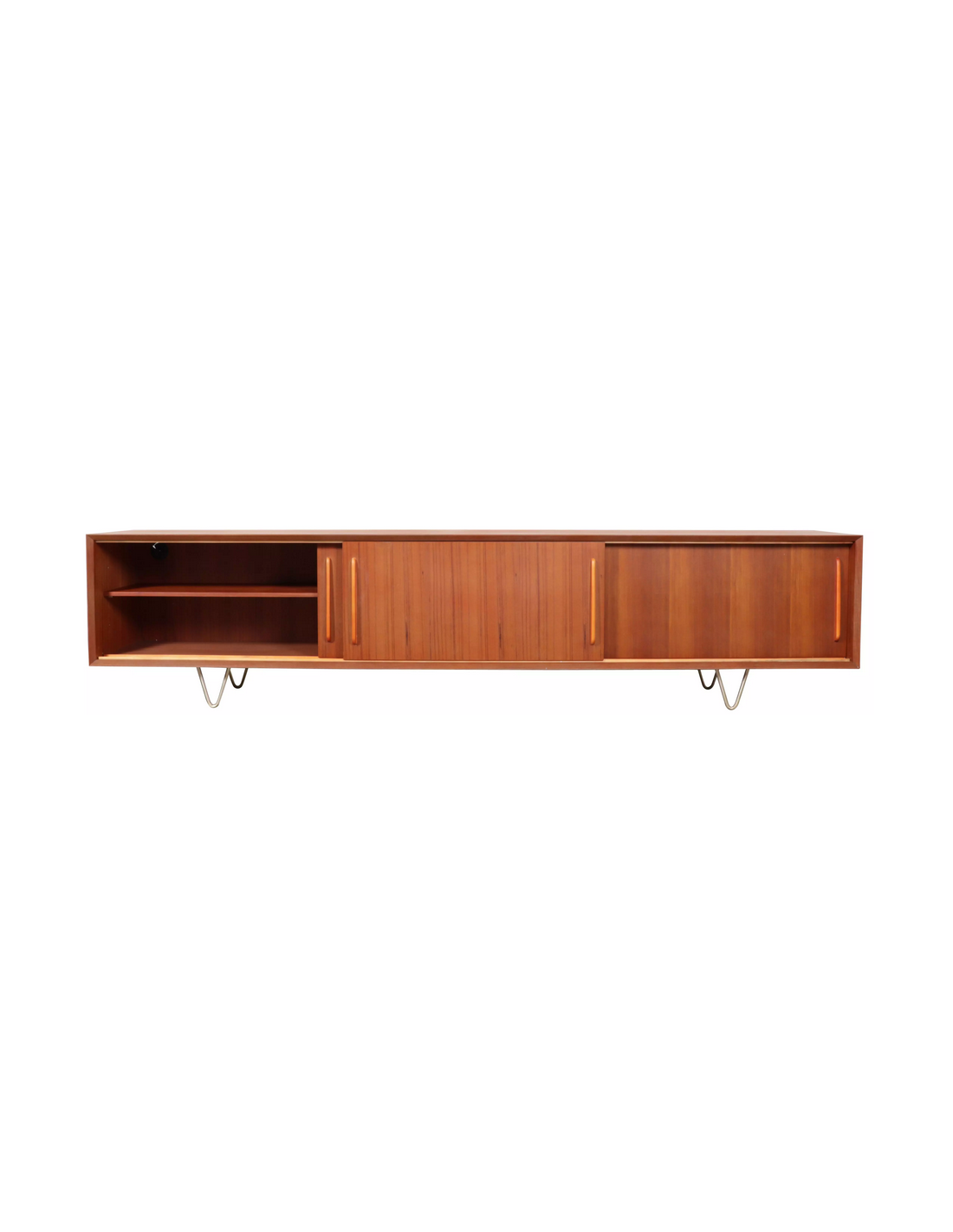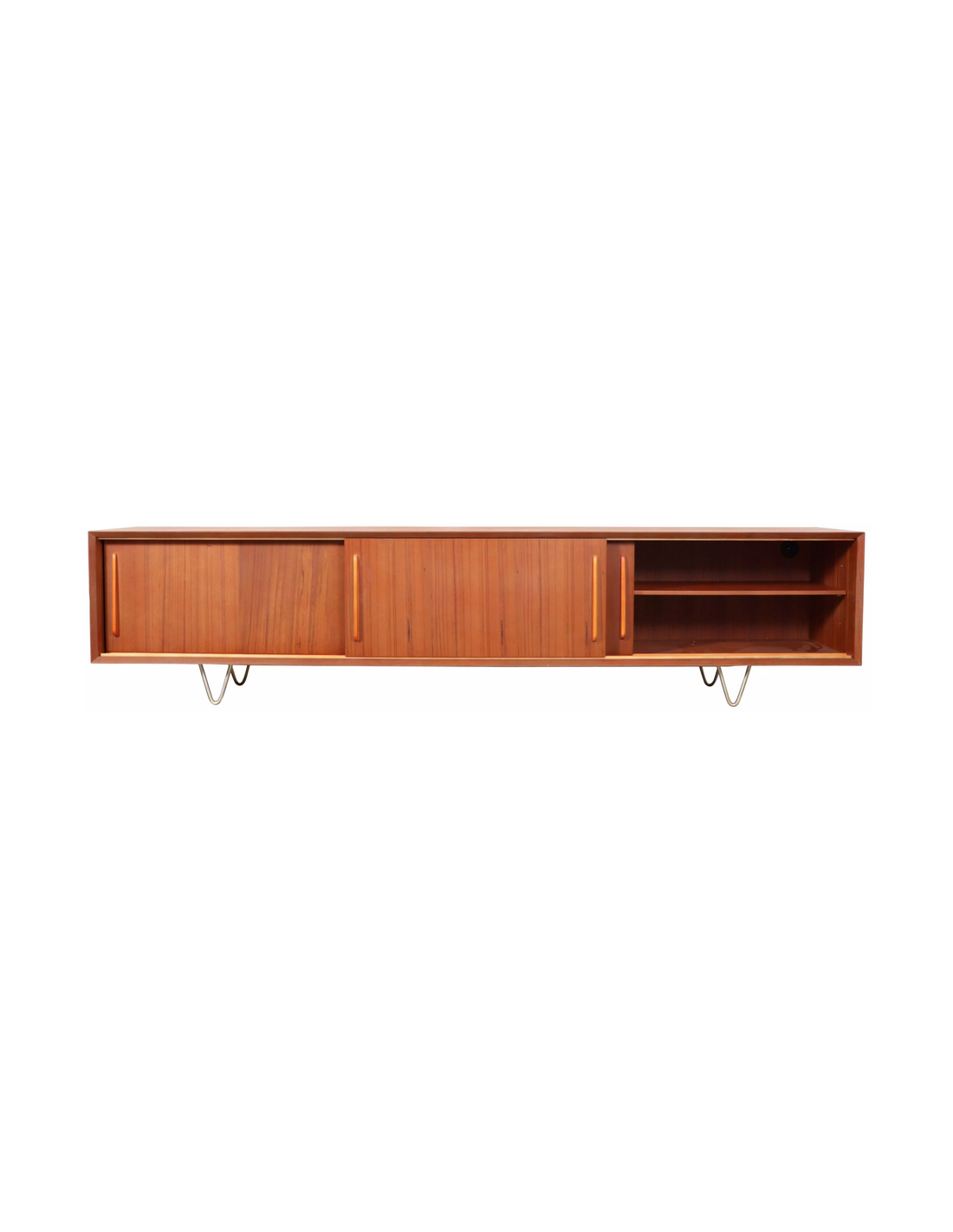 Tvbord udført i et design af guldfarvet metal og teaktræsfinér. Tvbordet har justérbare hylder i hvert af de 3 rum, samt skydelåger. Møblet måler 51 cm i højden og 220 x 45 cm i bredde og dybde.