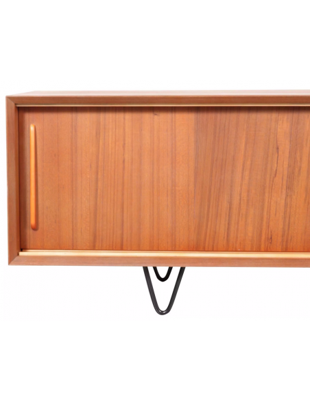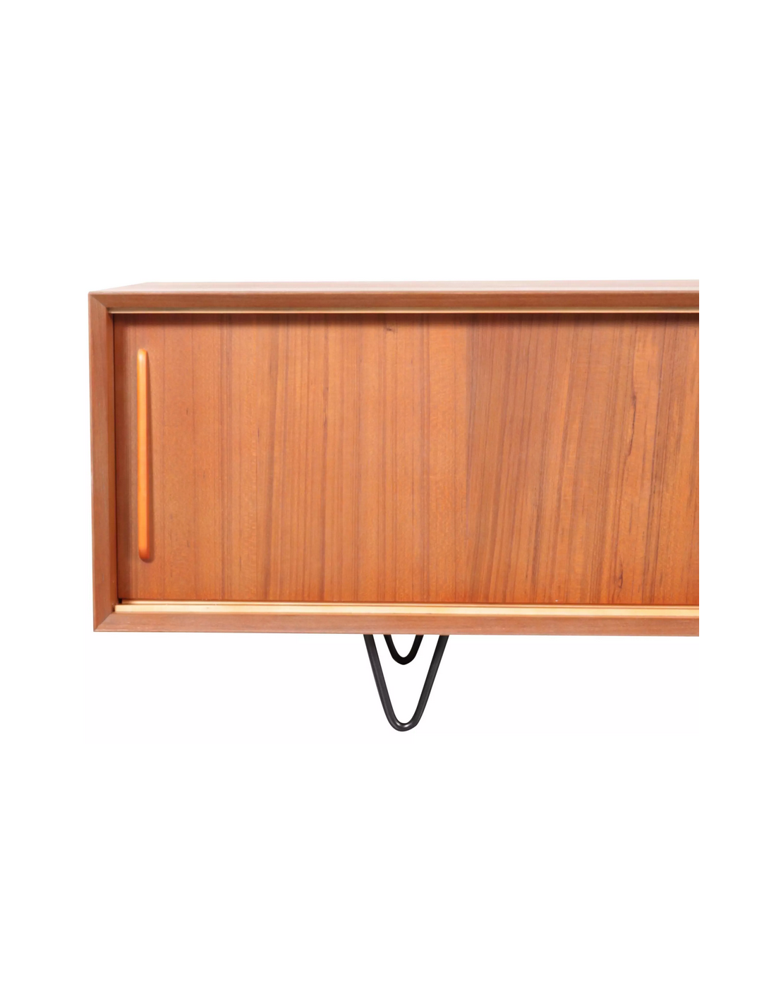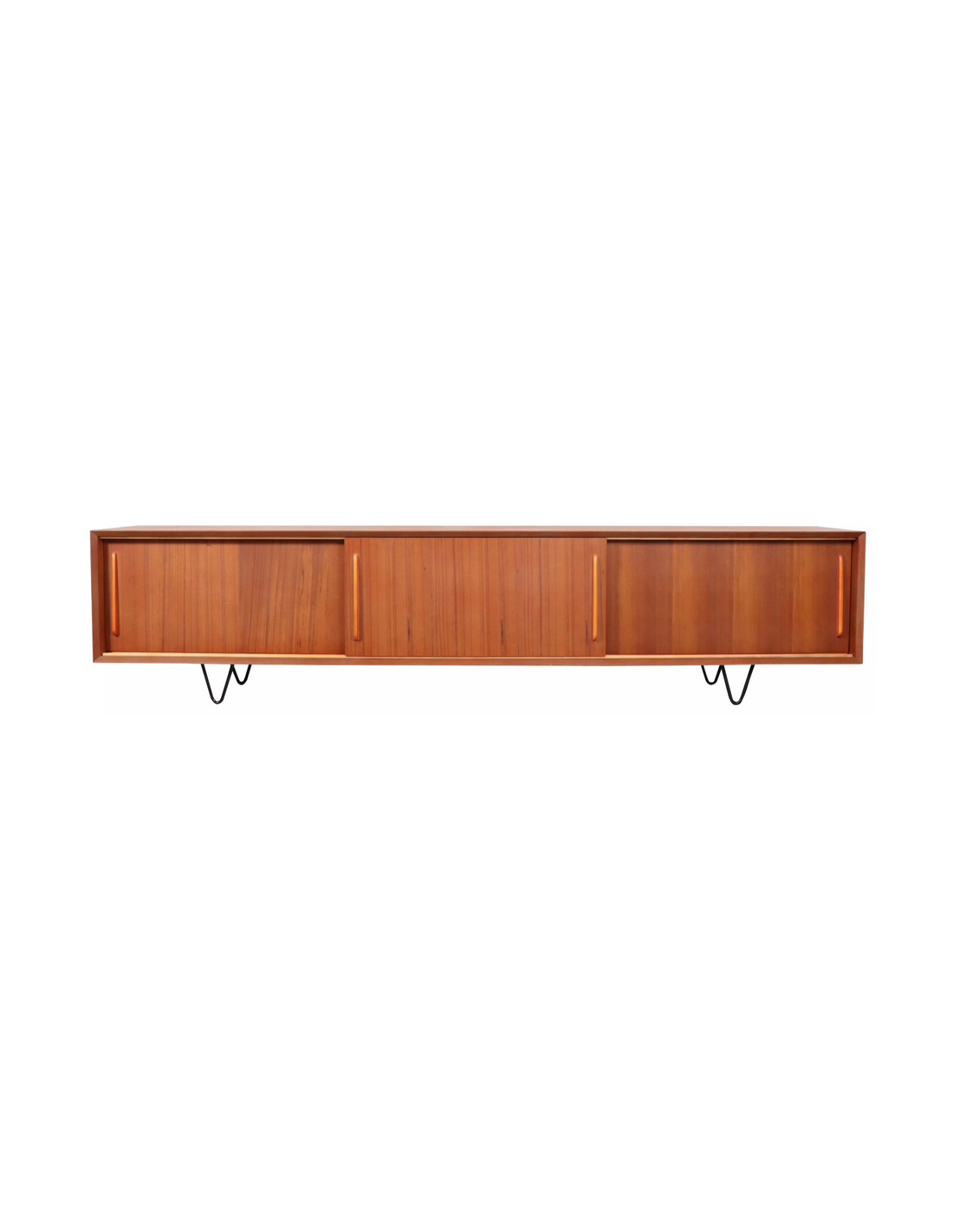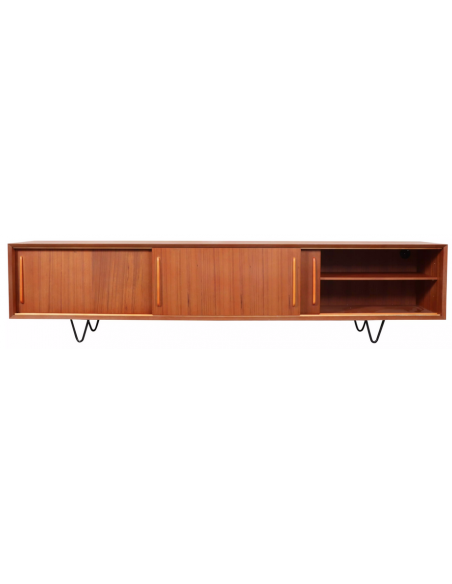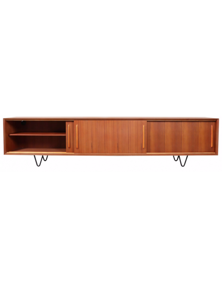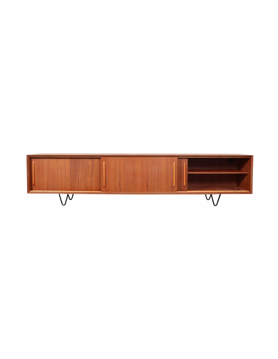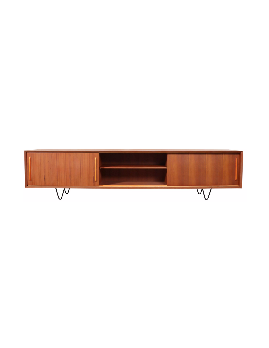 Tvbord udført i et design af sortlakeret metal og teaktræsfinér. Tvbordet har justérbare hylder i hvert af de 3 rum, samt skydelåger. Møblet måler 51 cm i højden og 220 x 45 cm i bredde og dybde.