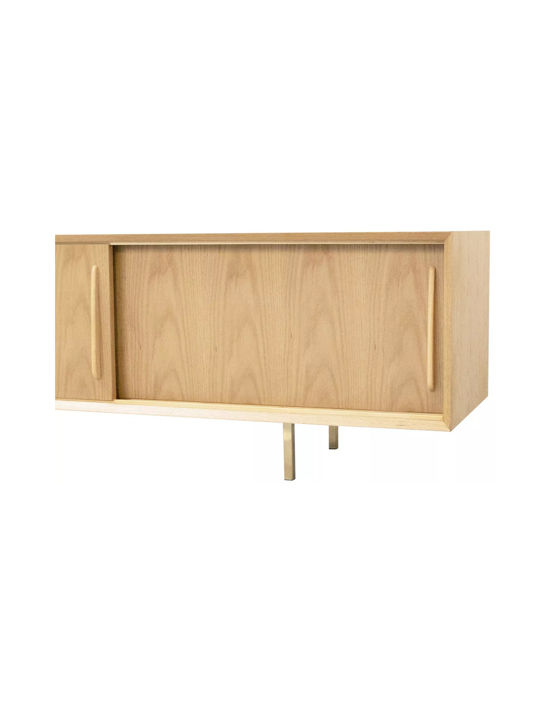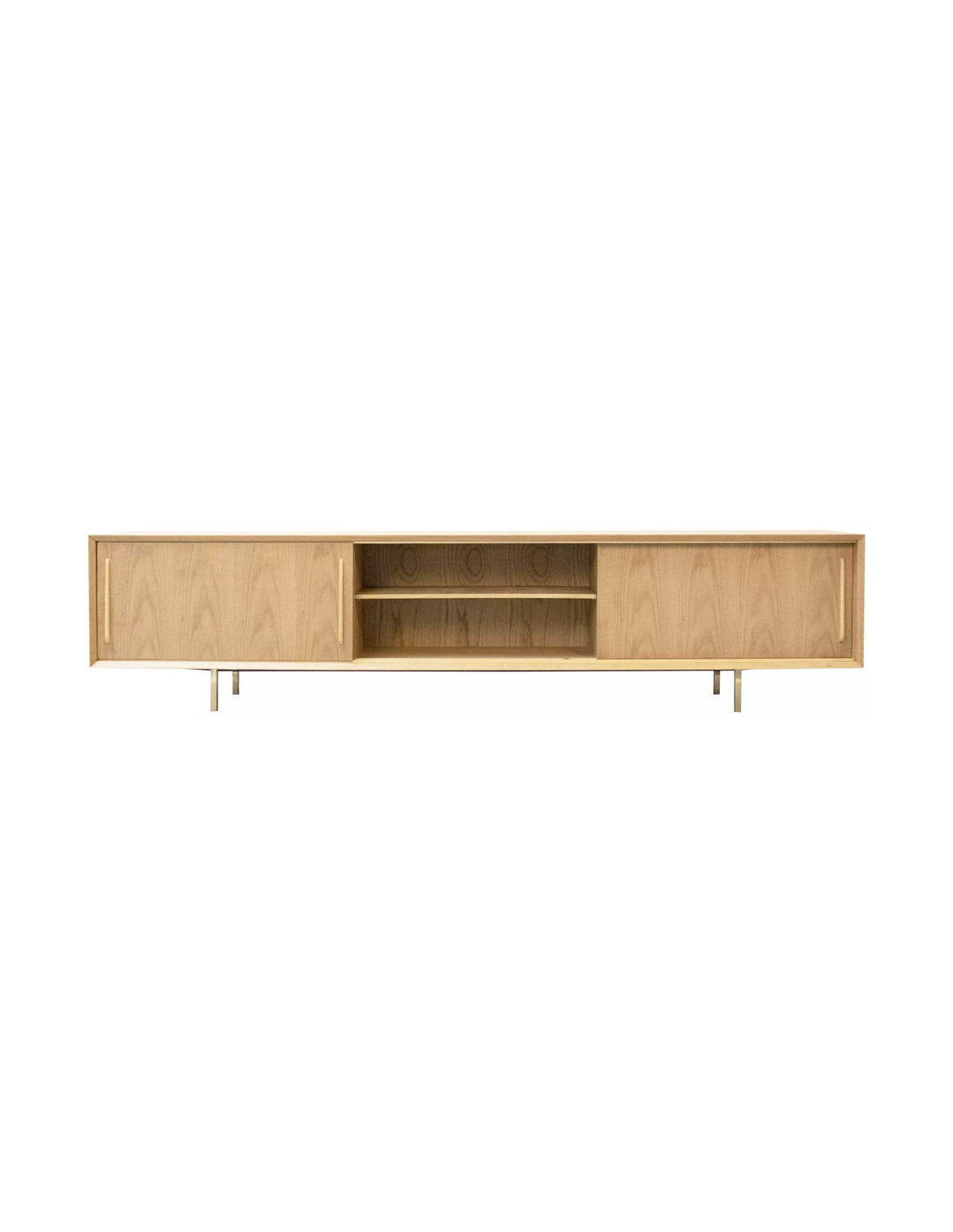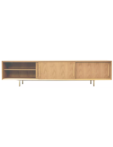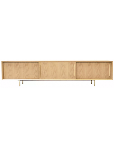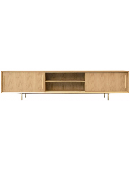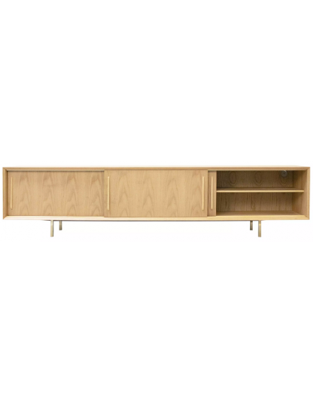 Tvbord udført i et design af guldfarvet metal og egetræsfinér. Tvbordet har justérbare hylder i hvert af de 3 rum, samt skydelåger. Møblet måler 51 cm i højden og 220 x 45 cm i bredde og dybde.