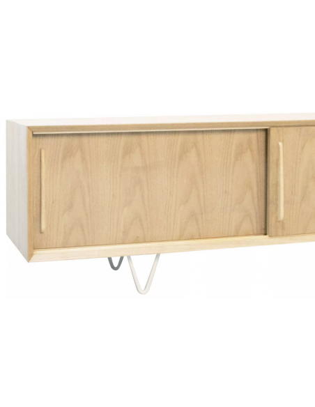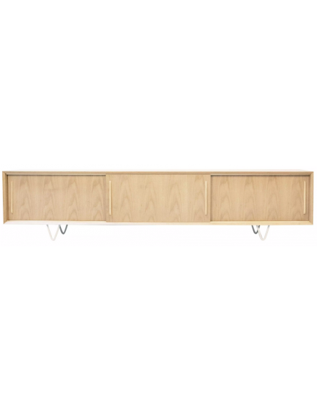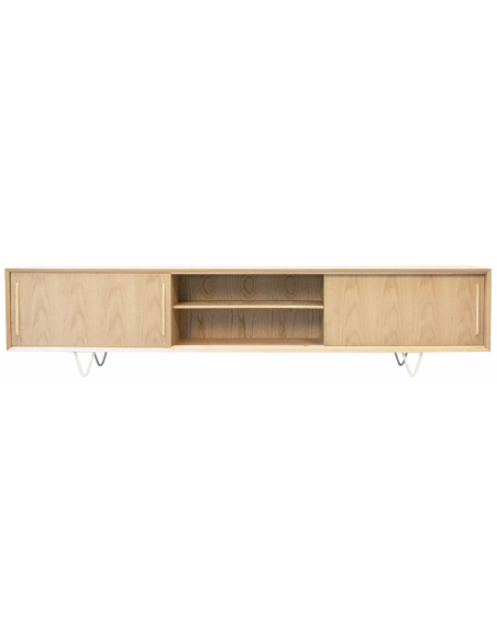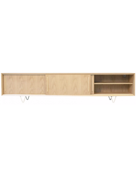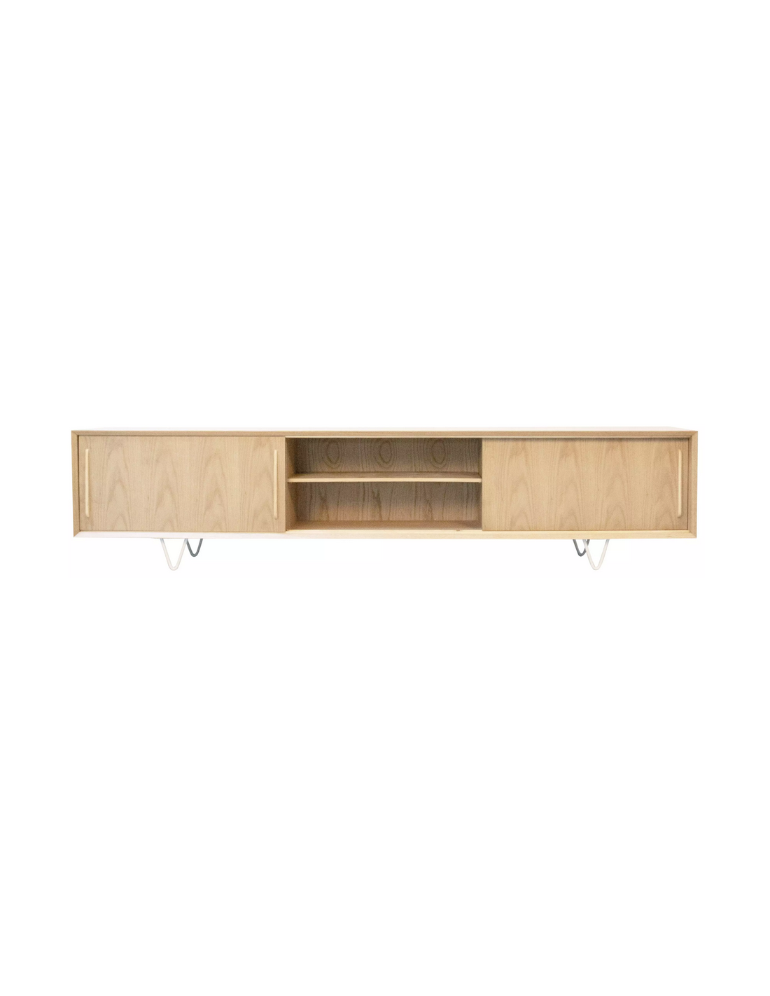 Tvbord udført i et design af hvidlakeret metal og egetræsfinér. Tvbordet har justérbare hylder i hvert af de 3 rum, samt skydelåger. Møblet måler 51 cm i højden og 220 x 45 cm i bredde og dybde.