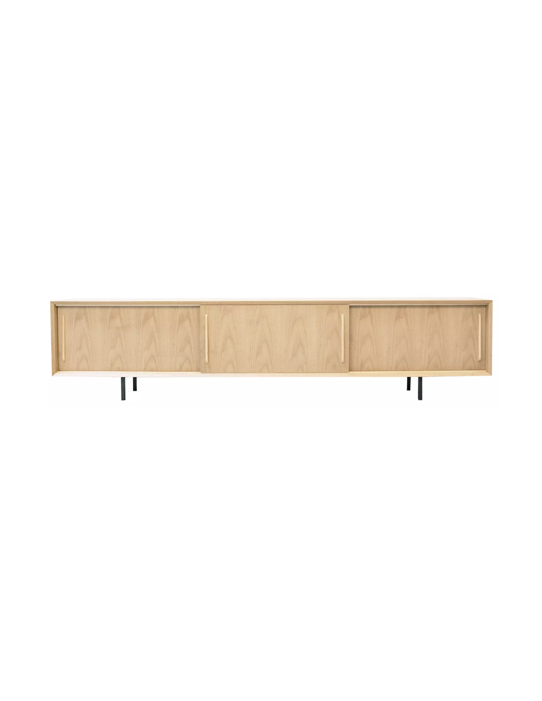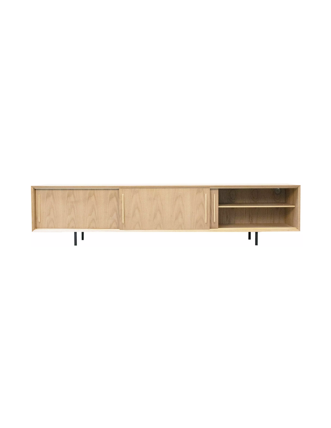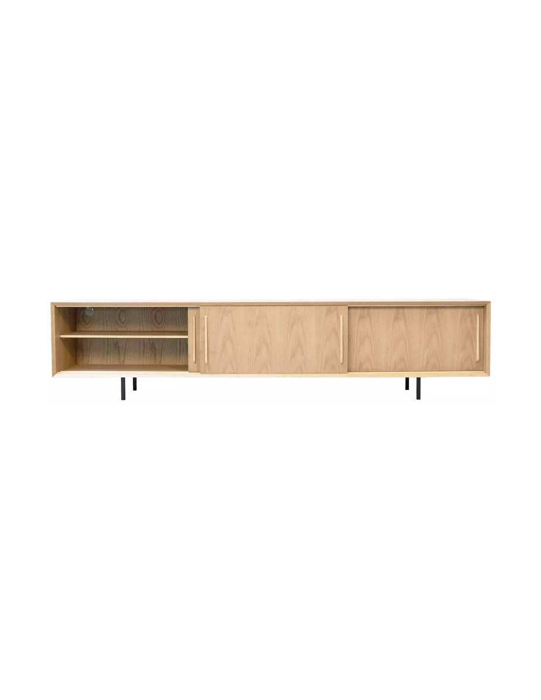 Tvbord udført i et design af sortlakeret metal og egetræsfinér. Tvbordet har justérbare hylder i hvert af de 3 rum, samt skydelåger. Møblet måler 51 cm i højden og 220 x 45 cm i bredde og dybde.