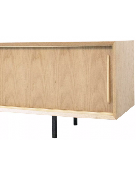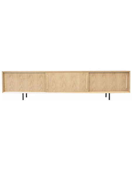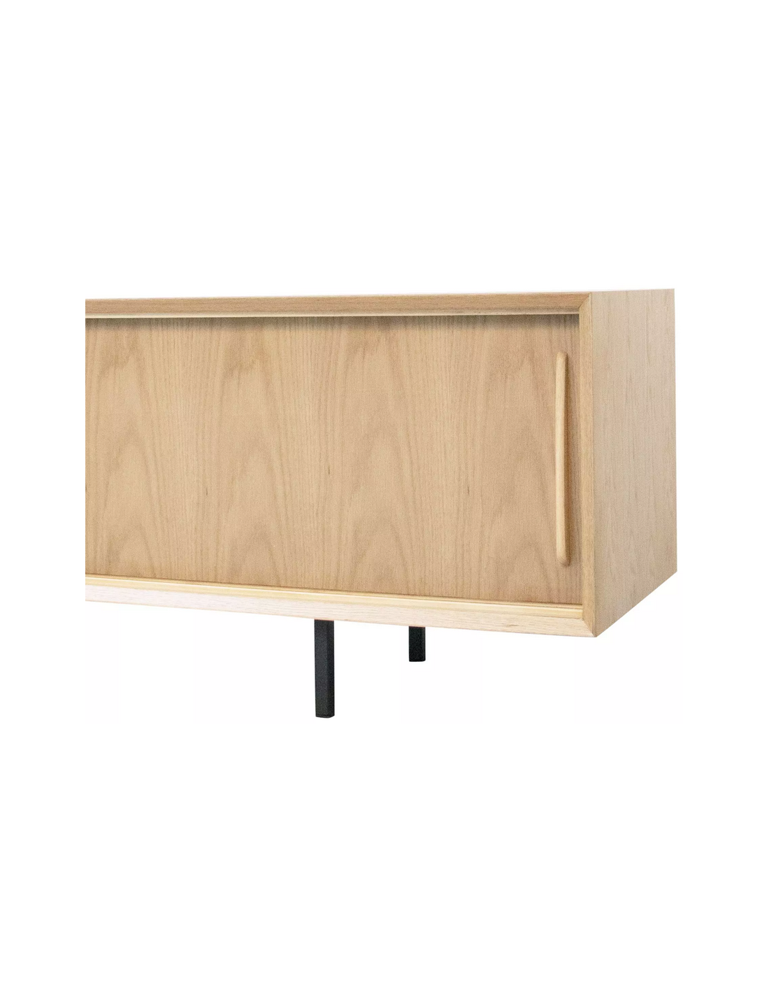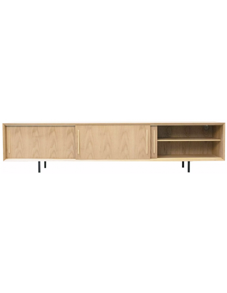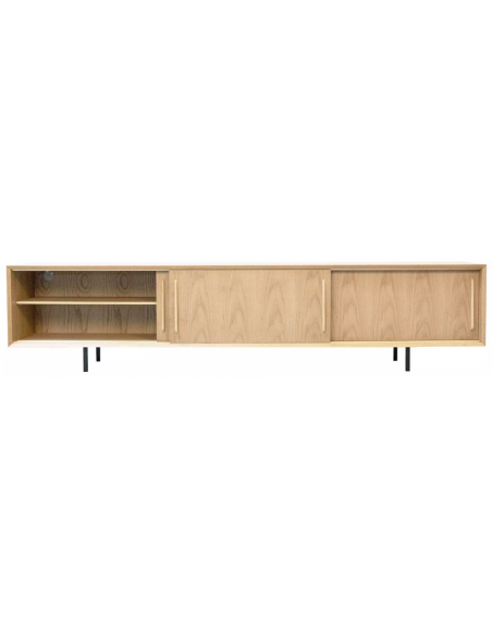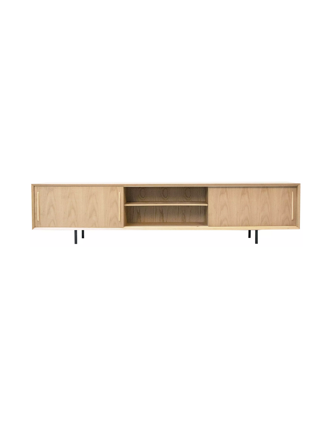Tvbord udført i et design af sortlakeret metal og egetræsfinér. Tvbordet har justérbare hylder i hvert af de 3 rum, samt skydelåger. Møblet måler 51 cm i højden og 220 x 45 cm i bredde og dybde.