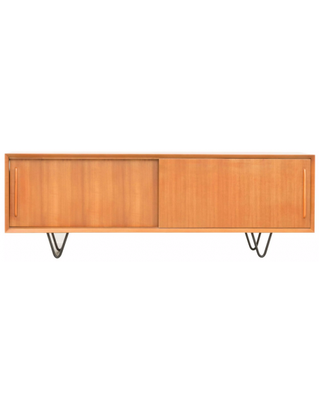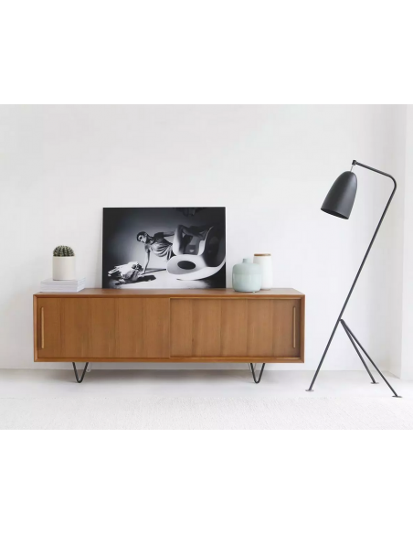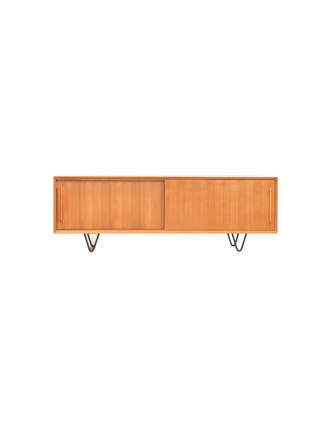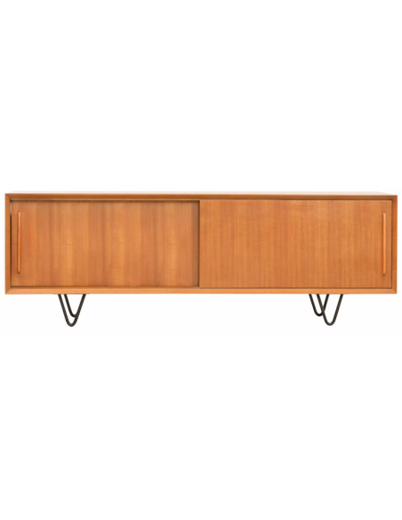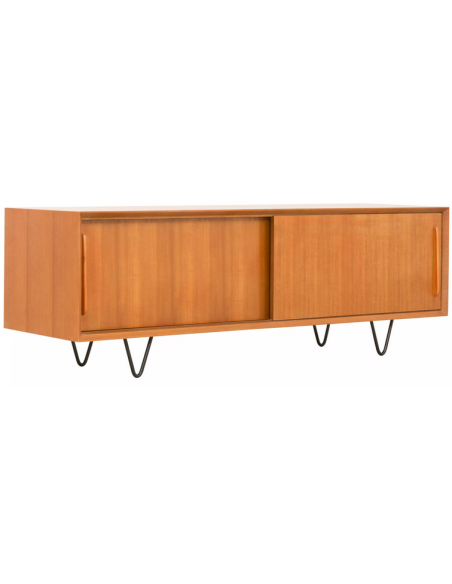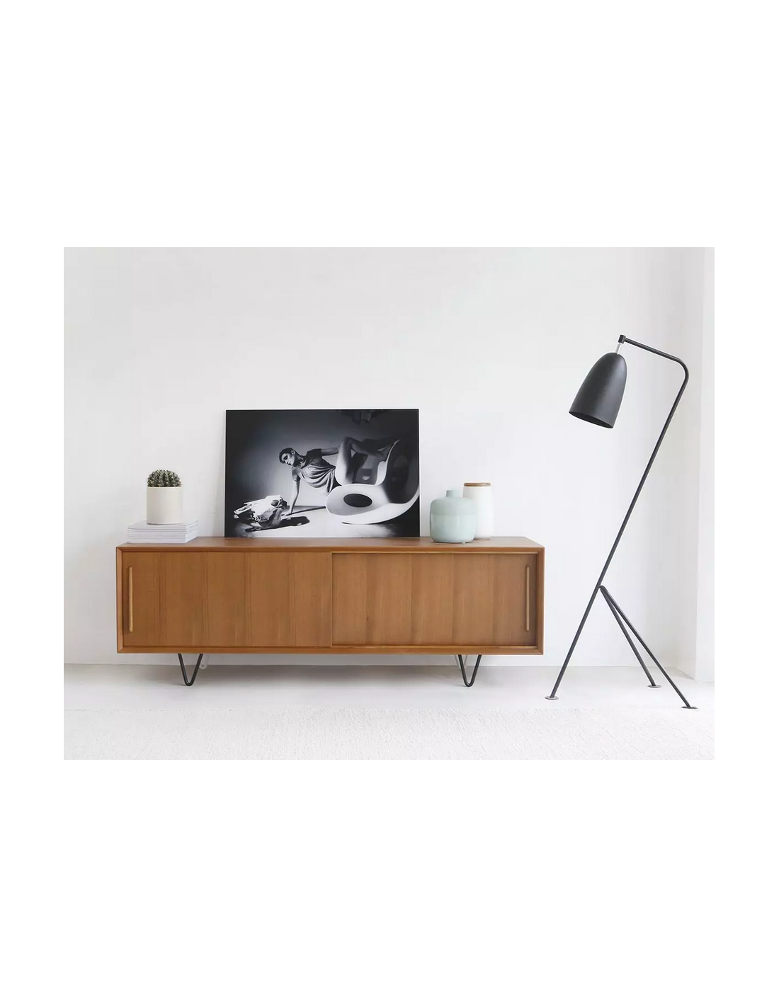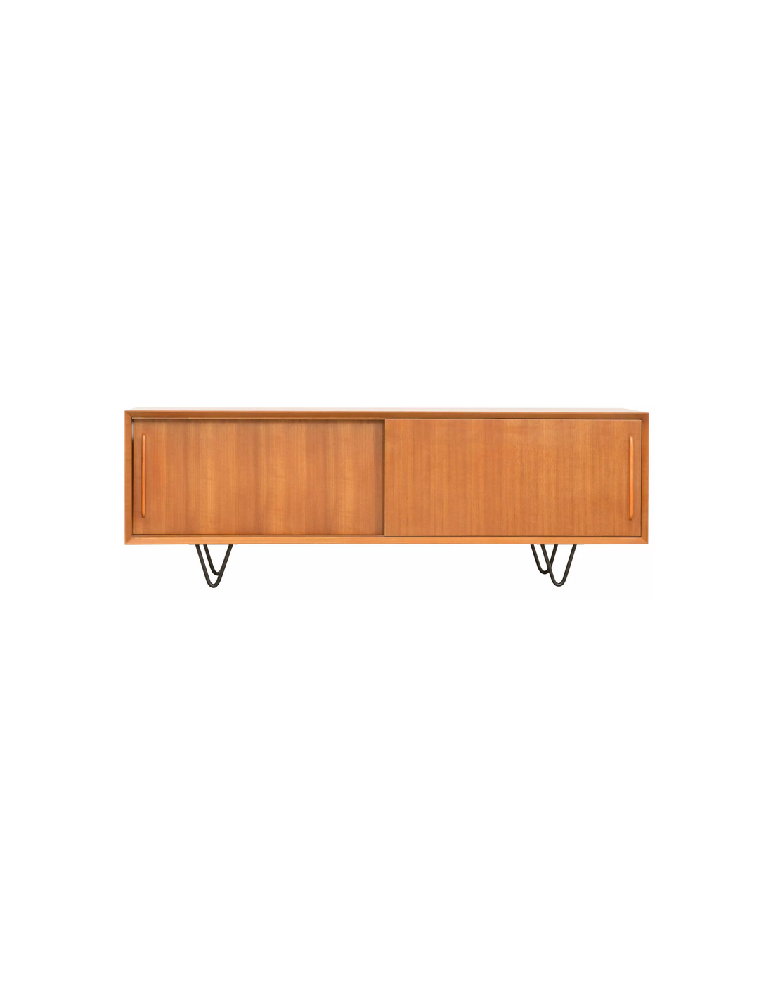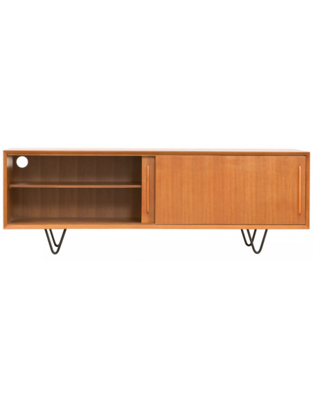 Tvbord udført i et design af sortlakeret metal og teaktræsfinér. Tvbordet har justérbare hylder i hvert af de 2 rum, samt skydelåger. Møblet måler 51 cm i højden og 150 x 45 cm i bredde og dybde.