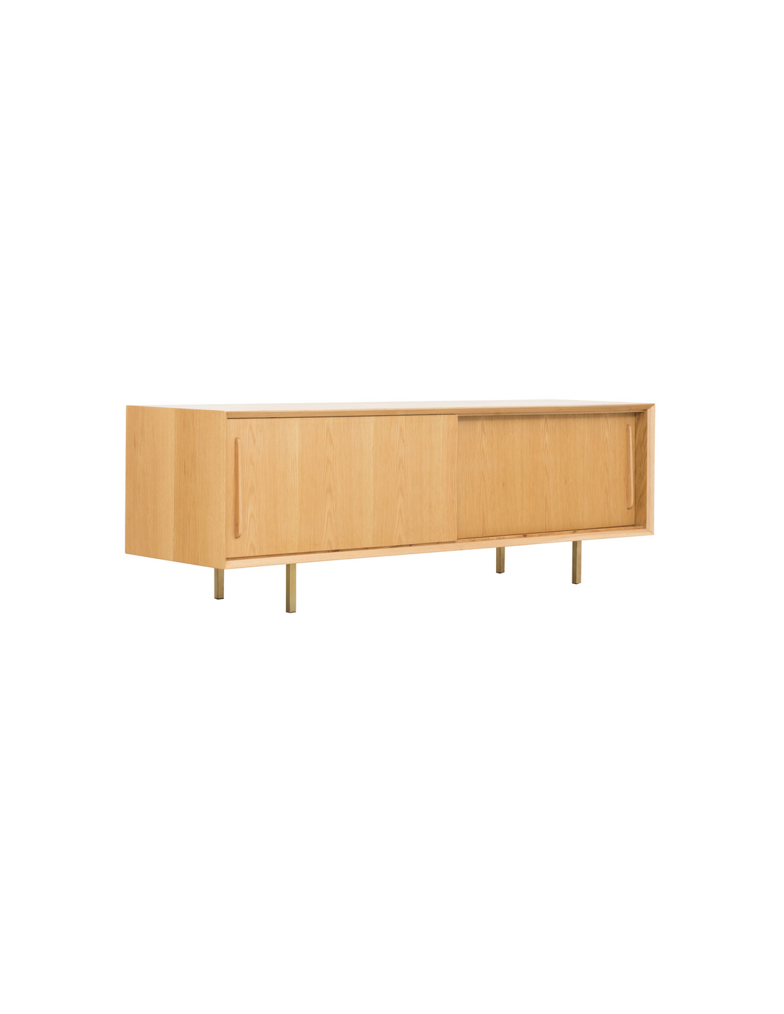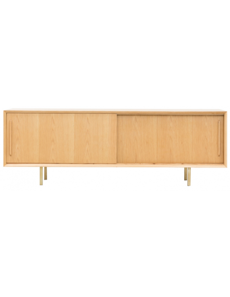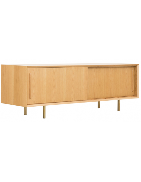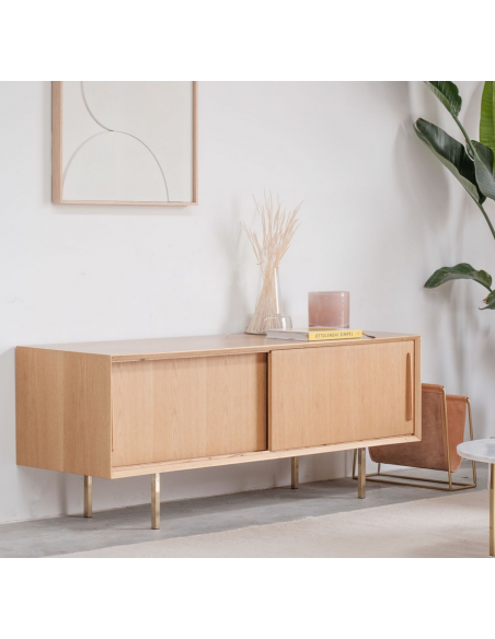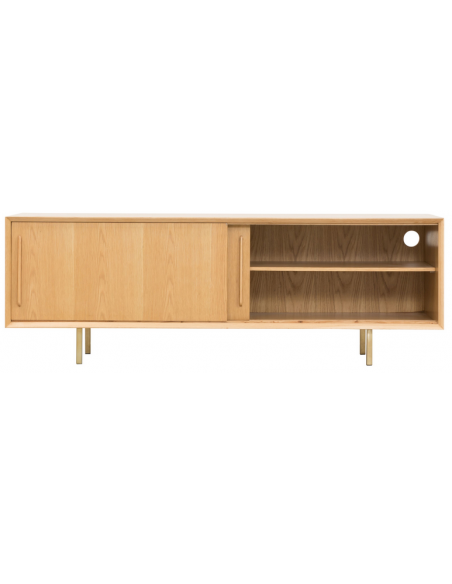 Tvbord udført i et design af guldfarvet metal og egetræsfinér. Tvbordet har justérbare hylder i hvert af de 2 rum, samt skydelåger. Møblet måler 51 cm i højden og 150 x 45 cm i bredde og dybde.